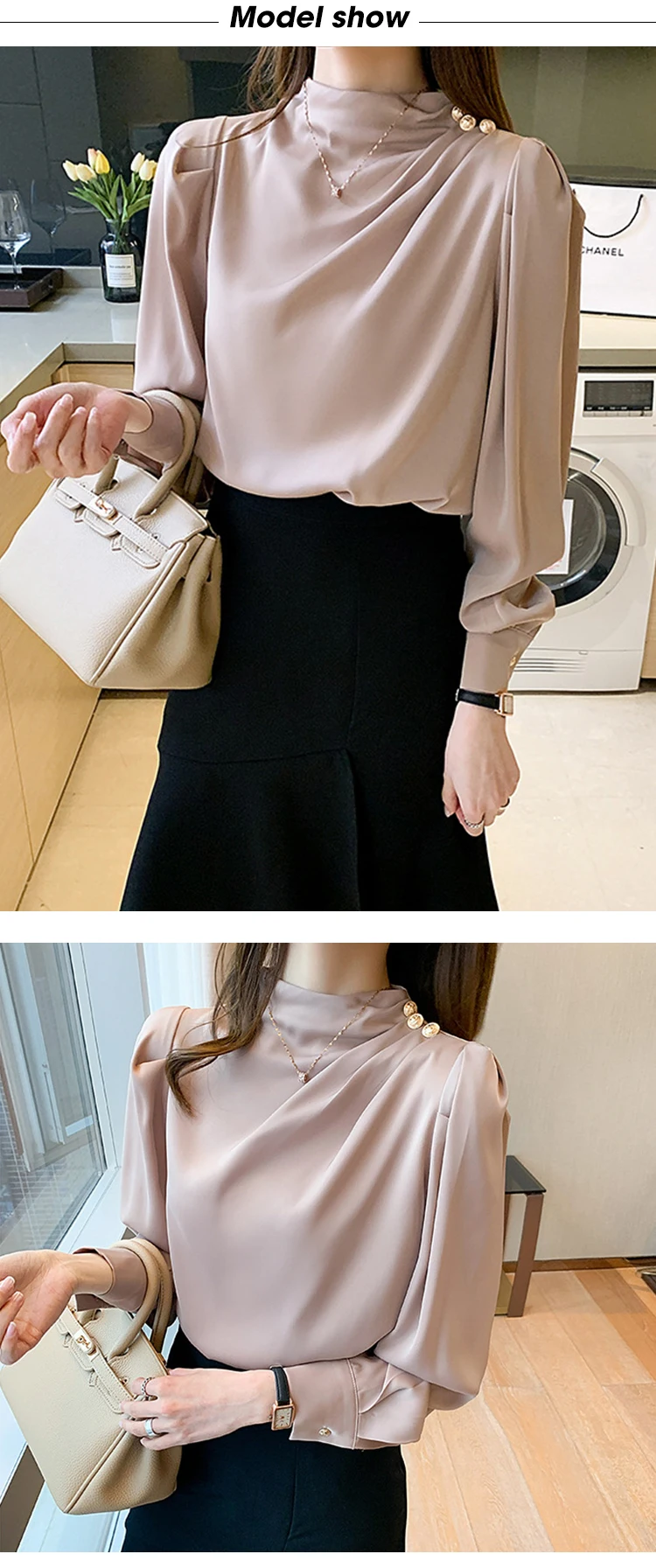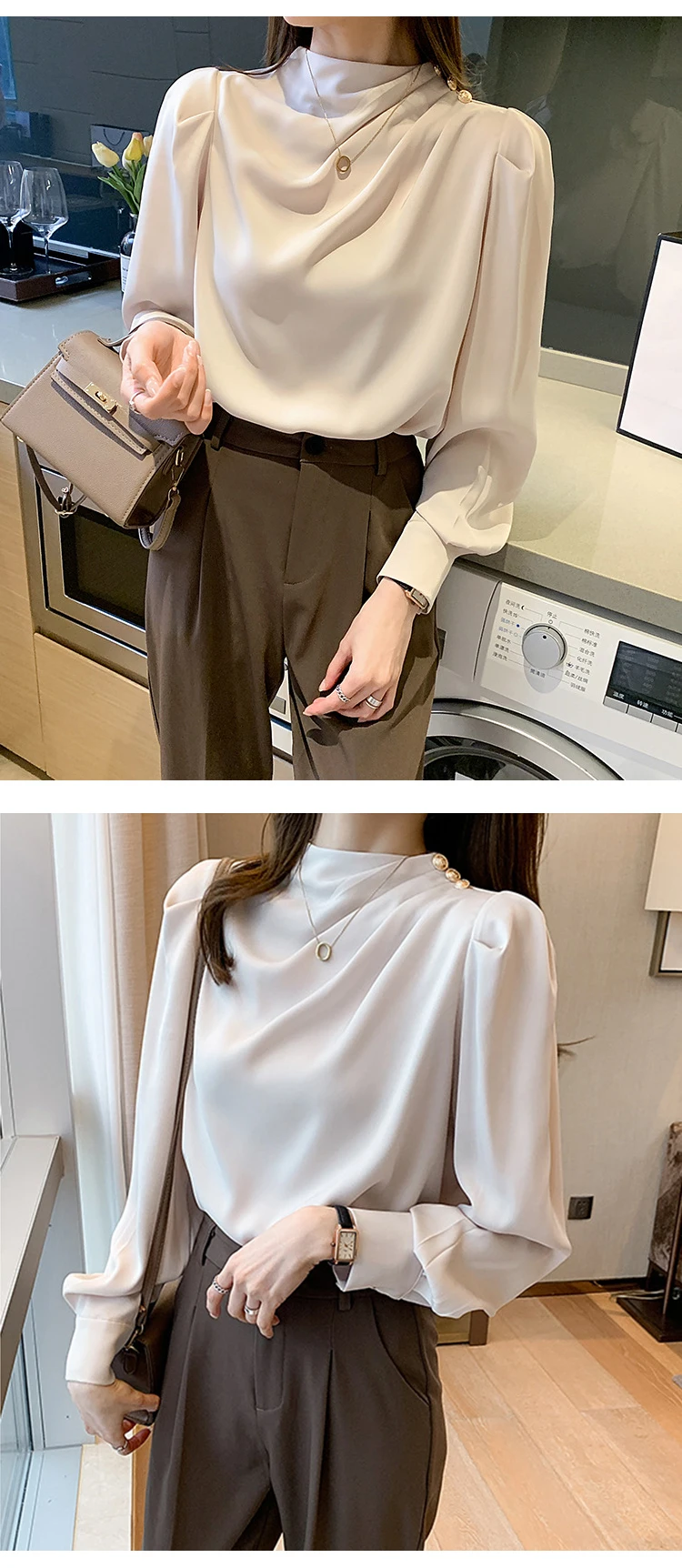Color: Pink, Size: L, Ships From: CHINA - Spring Autumn Elegant Office Women Shirt Mujer Chic Satin Formal Lantern Sleeve Blouse Tops Loose Pullover Jumper Street Clothes