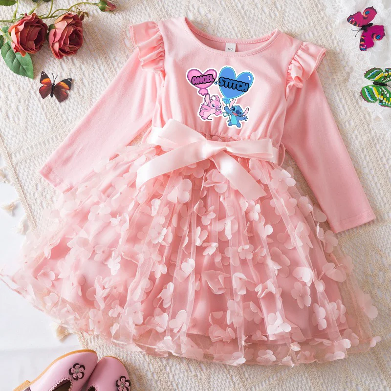 Color: Pink, Size: One Size, Height: 158 - Lilo Stitch Girl Baby Dresses Spring Autumn Child Long Sleeve Sweet Princess Dress Mesh Newborn Casual Dress Birthday Party 2-6Y
