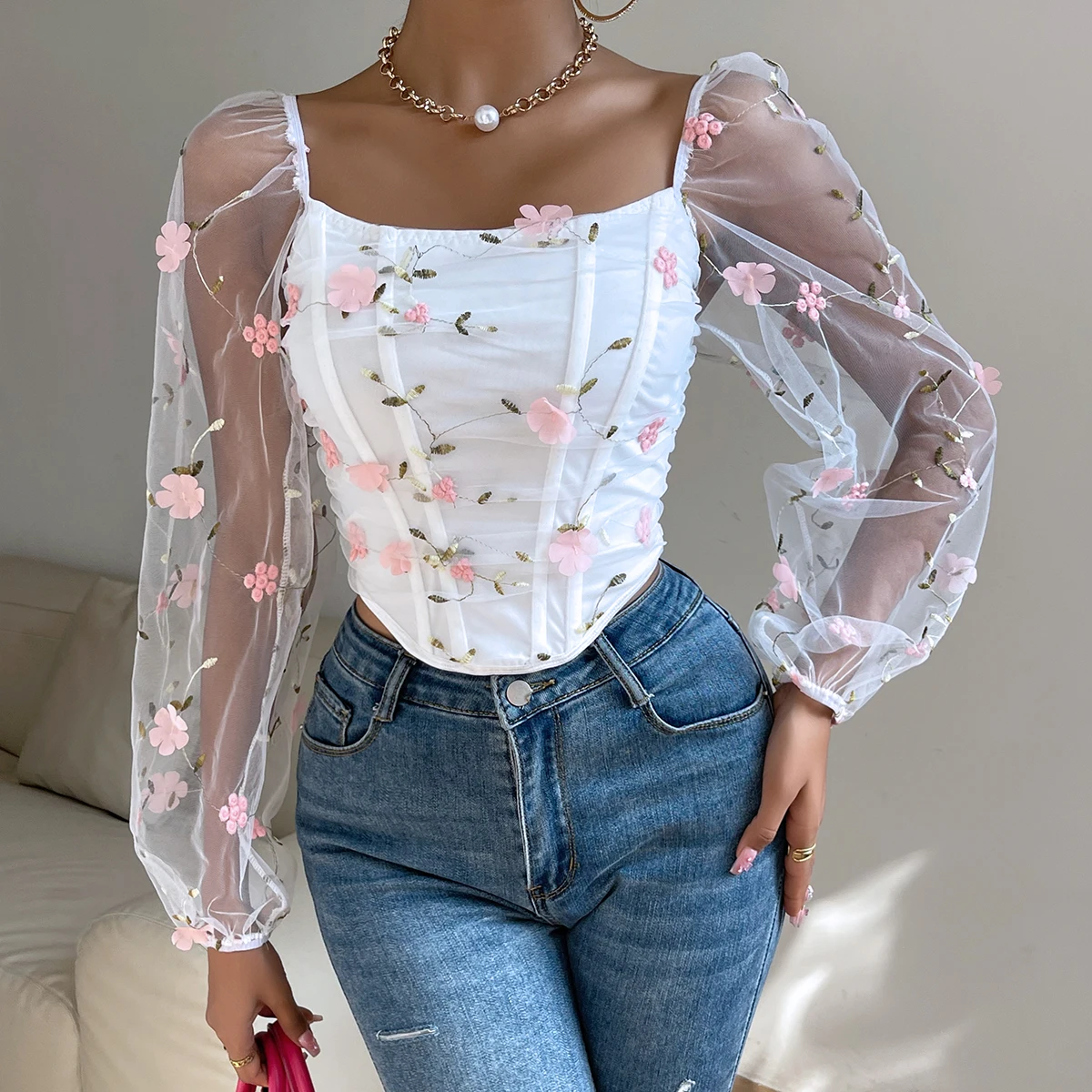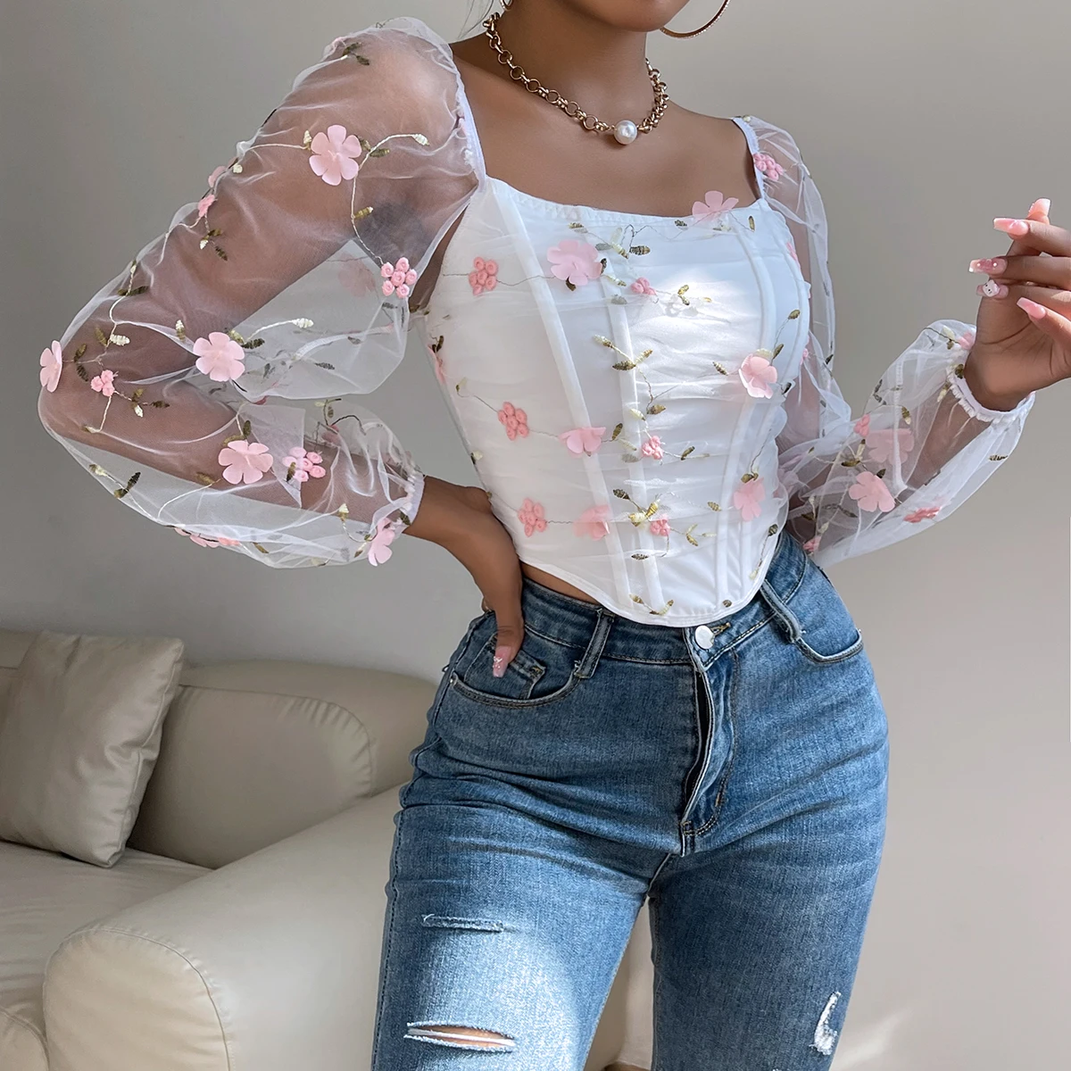 Color: Pink, Size: S - Vemina Sexy?‹ Embroidery Long Sleeve Slim Tops For Women Summer,Hollow Mesh Sheer Backless Puff Sleeve Fishbone Skinny Crop Top