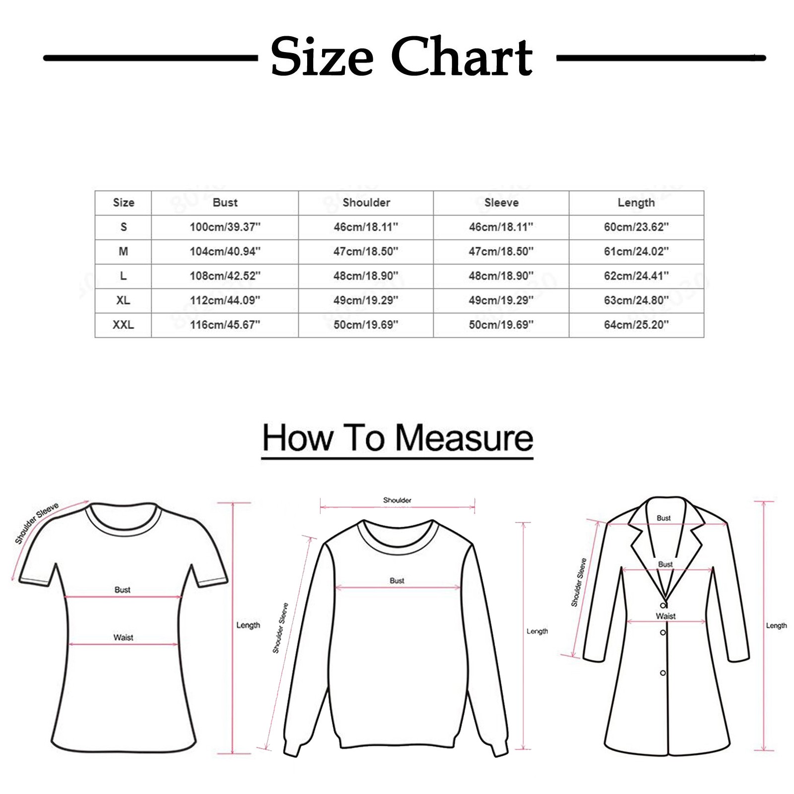 | Size:S | Bust:100cm/39.37'' | Shoulder:46cm/18.11'' | Sleeve:46cm/18.11'' | Length:60cm/23.62'' |