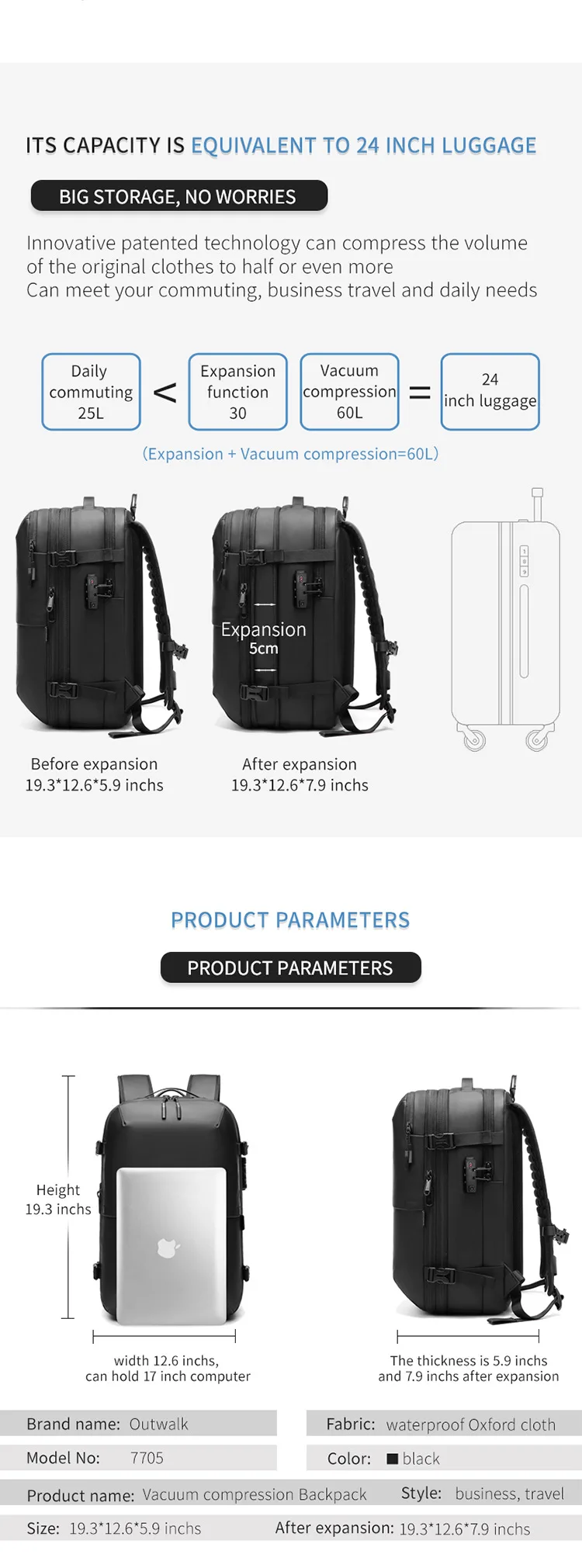 Airback Vacuum Compression Backpack with Vacuum Pump 60L Expandable Travel Backpack for Men Women Airline Approved Business Bag