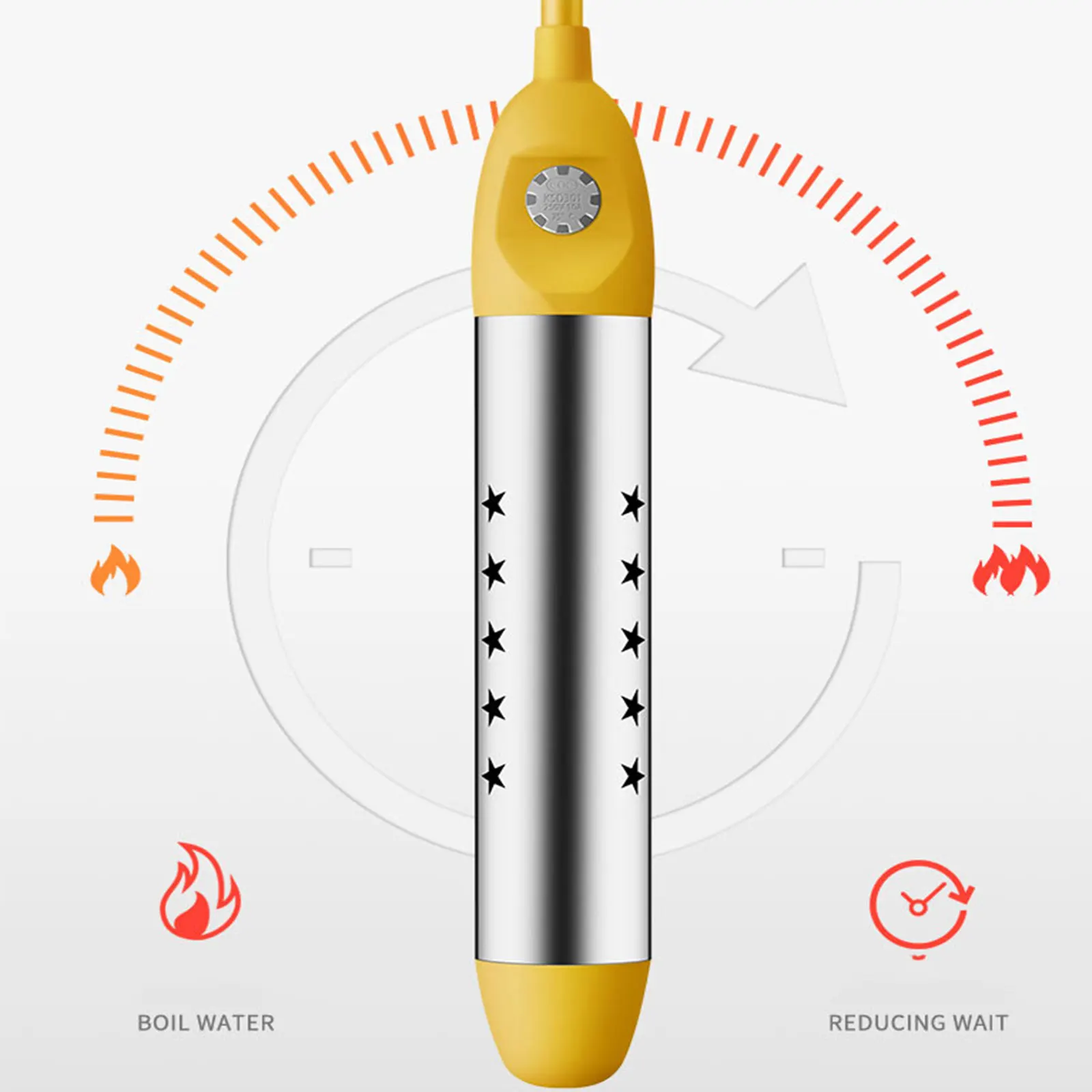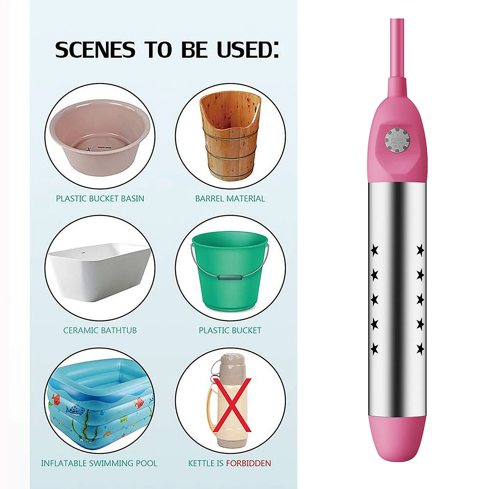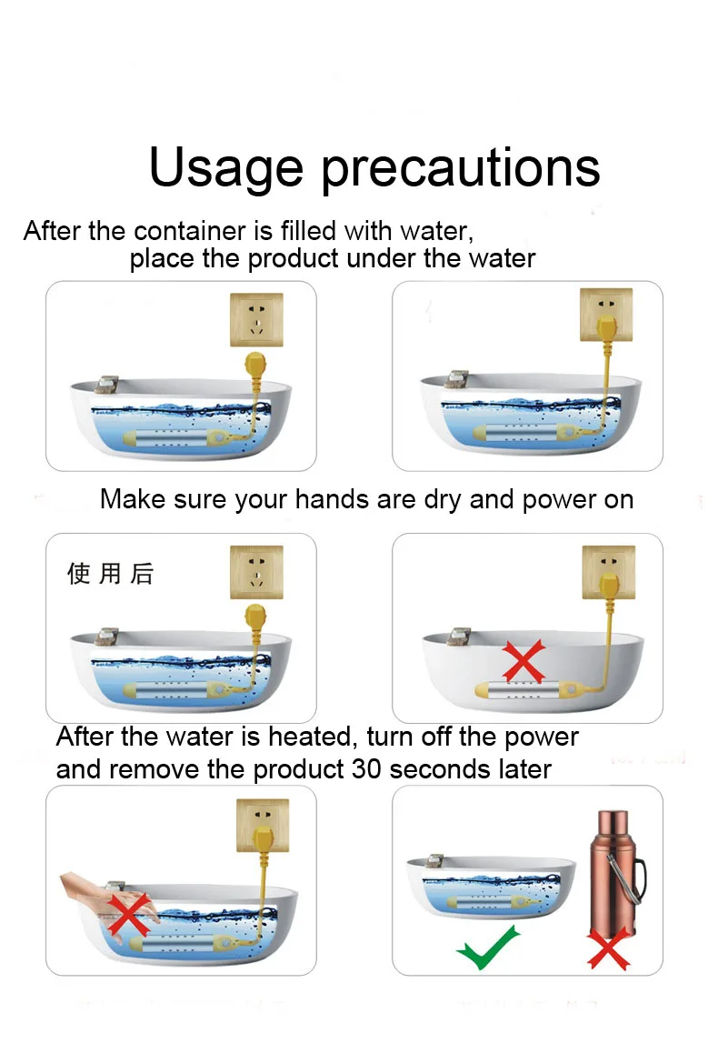 Note: When using the product, it is necessary to immerse completely the product in water, and then electrify it for heating. If the power is on first, and then slowly put it into the water, the shell may melts in a short time.