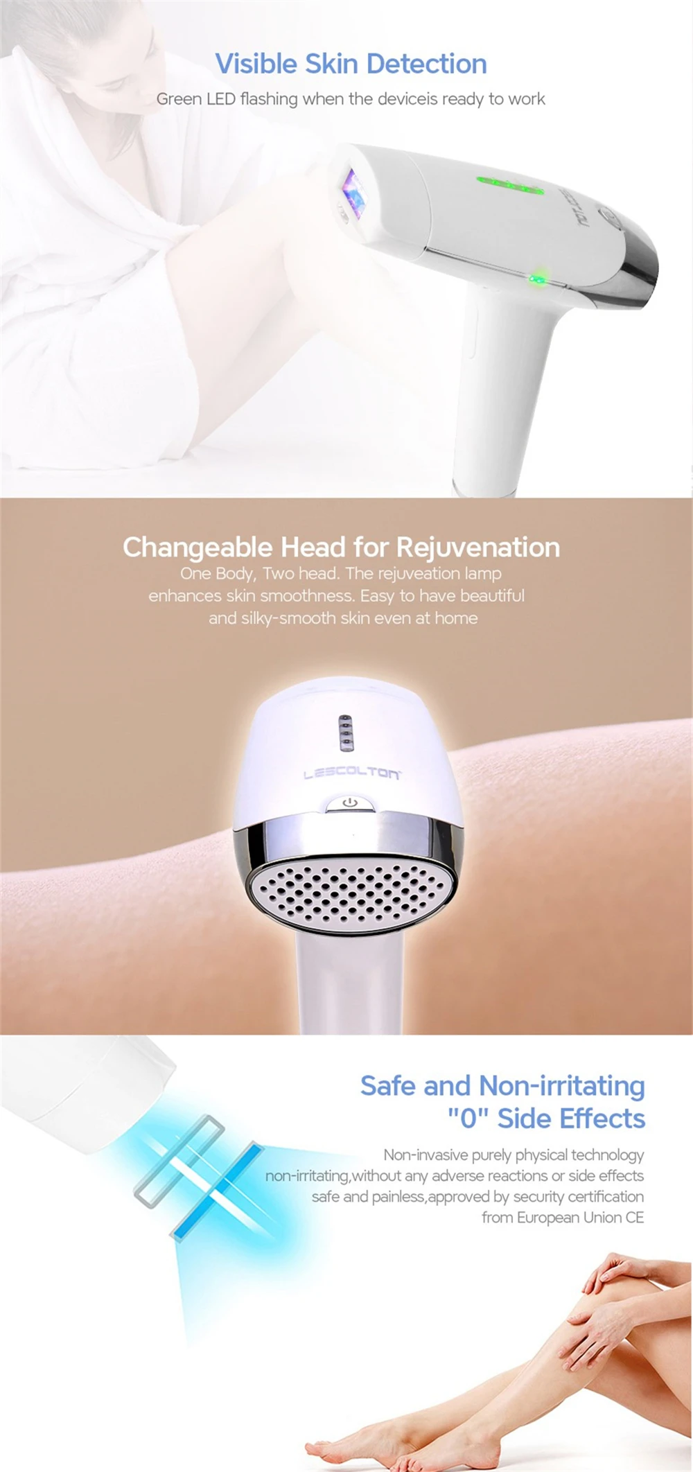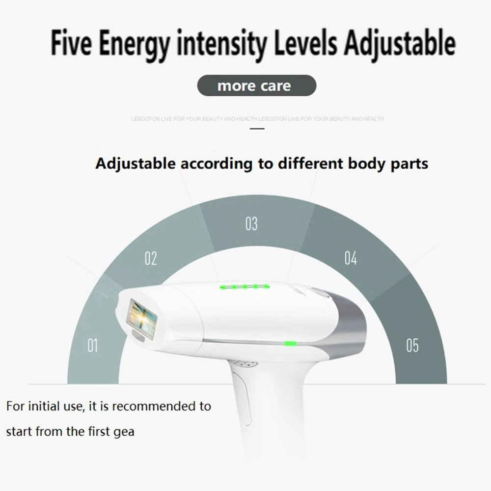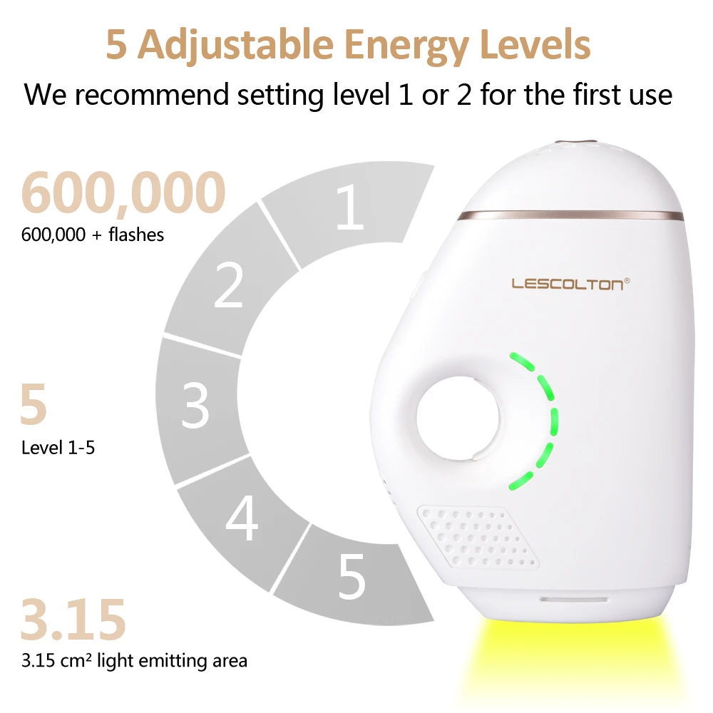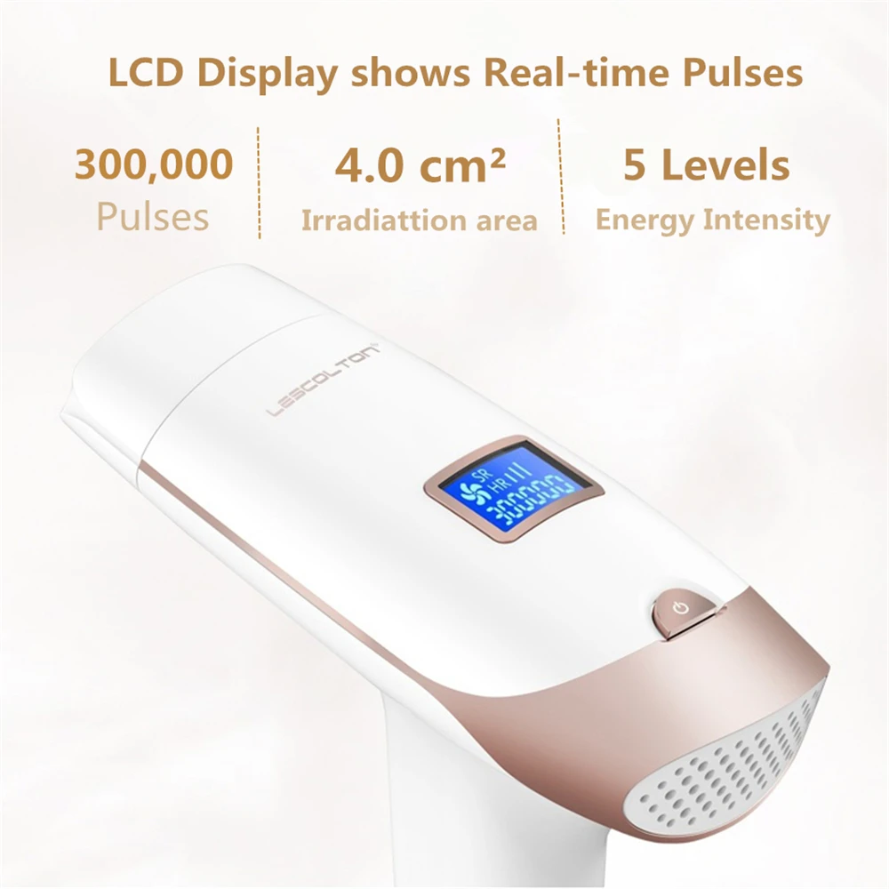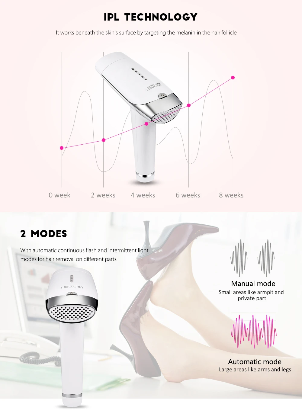 Thank you for choosing the Newest   Lescolton IPL Laser Hair Removal Machine Laser Epilator Hair Removal Permanent Bikini 5 levels Home Electric depilador a laser. Comparing with another popular models, this model uses the high level Quartz lamp for the hair removal so that have much more flash times