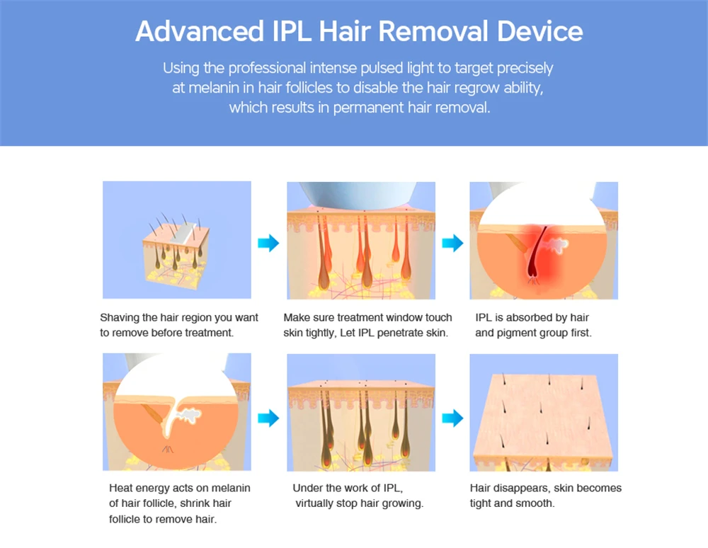 2. Permanent: IPL works inside pores, destroys hair papilla, thus achieves permanent hair removal