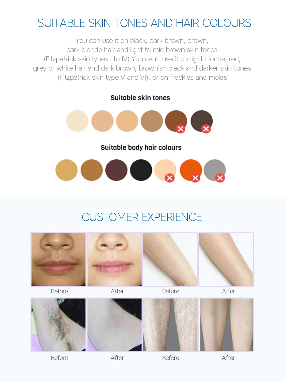 6. Fast and big treatment area : 3.6/3.8/4.0/4.8 square cm spot size not too big or neither too small for any body curve, high efficiency and fast speed that just takes several minutes to remove the overlapping regin hair which is difficult for traditional hair removal method