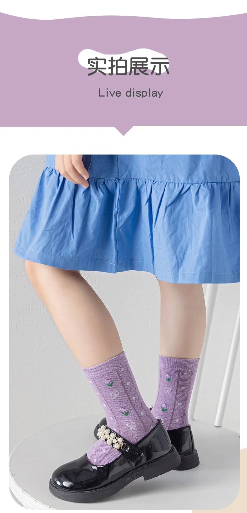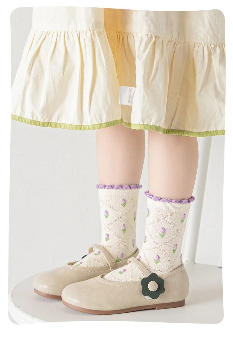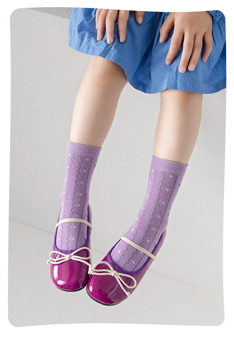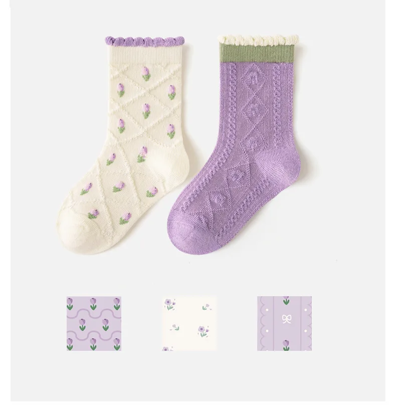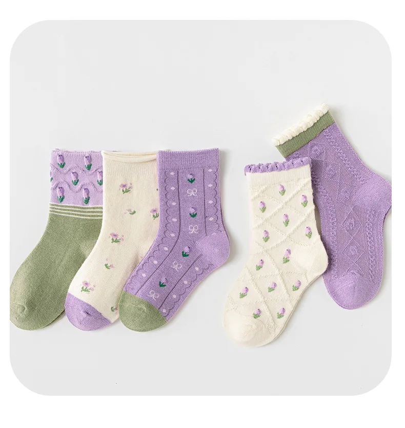 Color: PURPLE, Size: 2-3T - 5 pairs/lot Children's Socks Autumn Socks Girls Sweet Purple Floral Pattern Mid Calf Socks Baby Infant Cotton Socks
