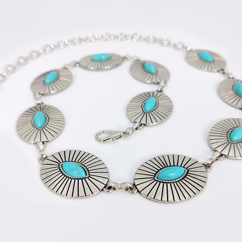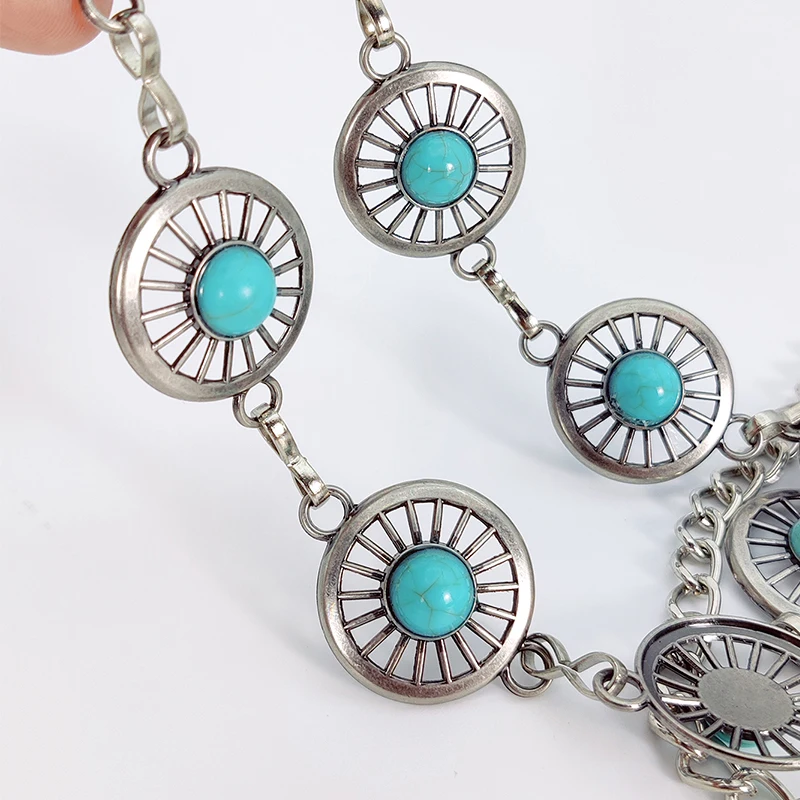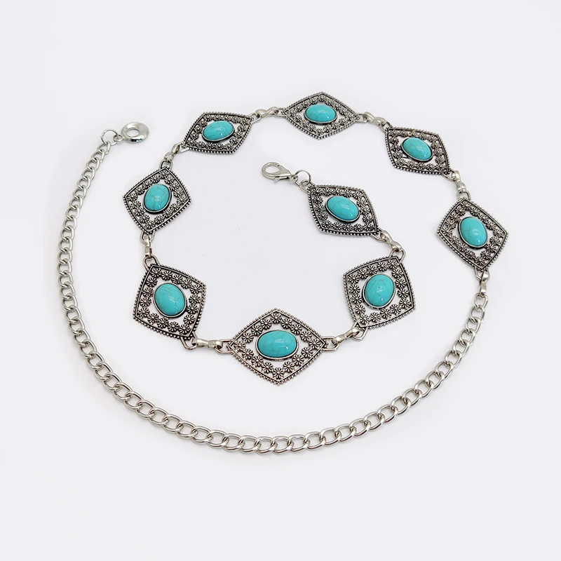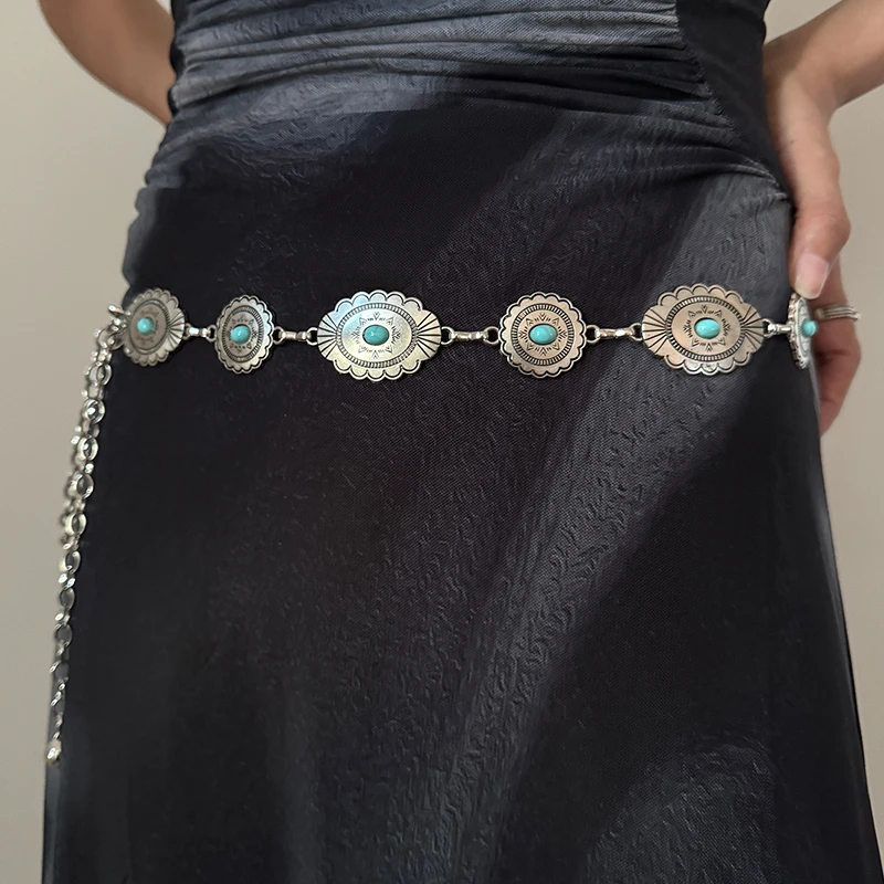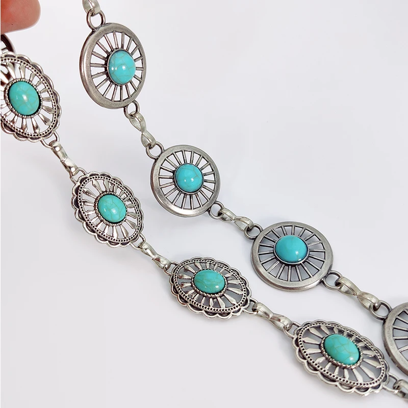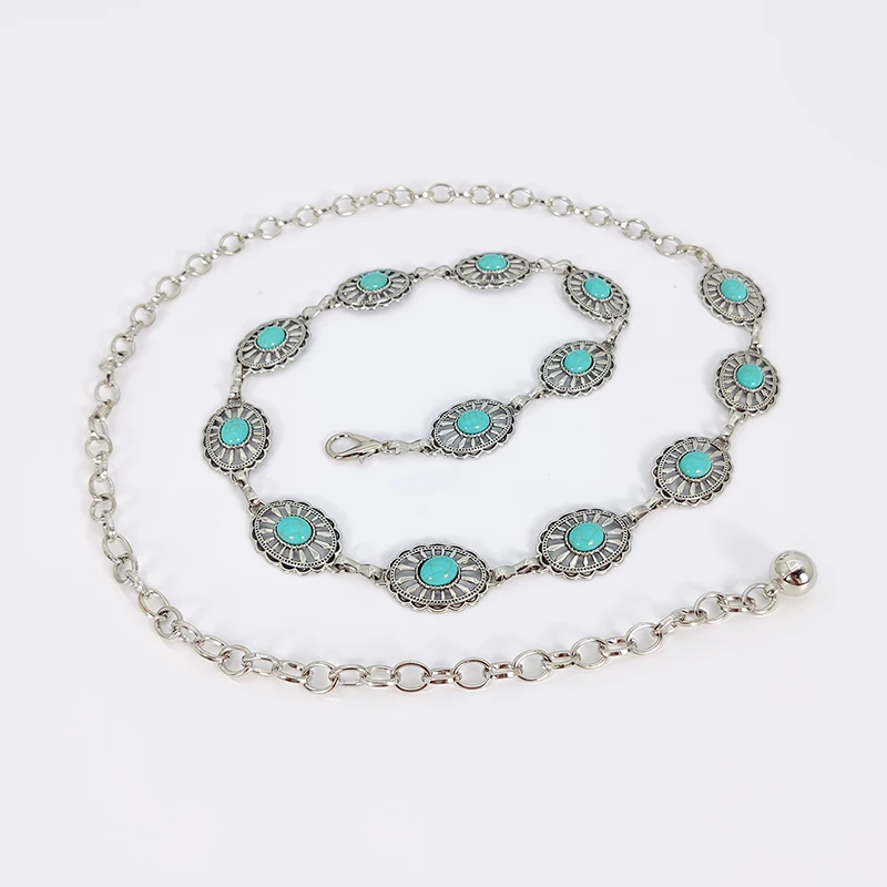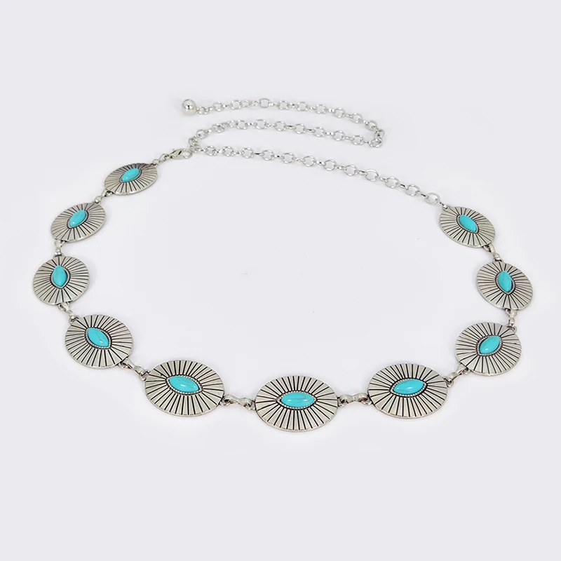 Fashion Silver Bohemian female circular waist chain luxury blue gemstone Ellipse chain belts for women suitable for Skirts dress