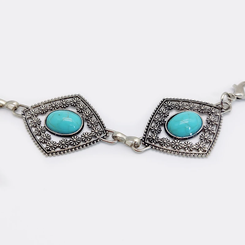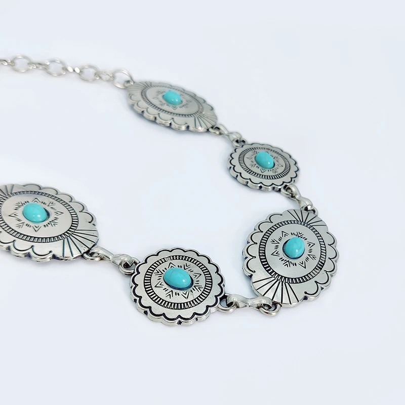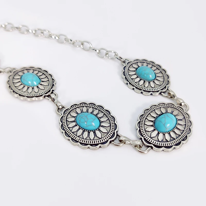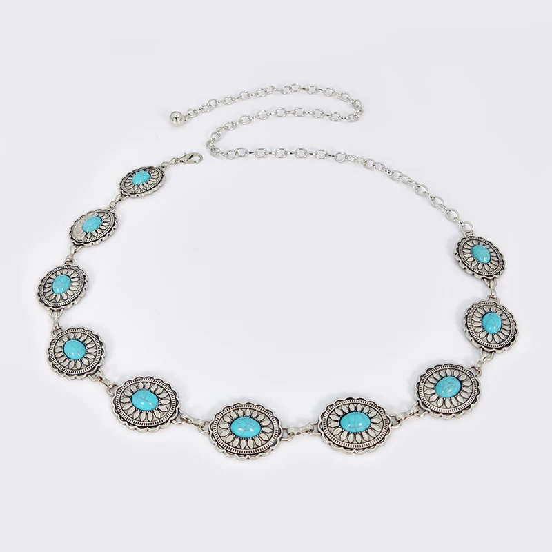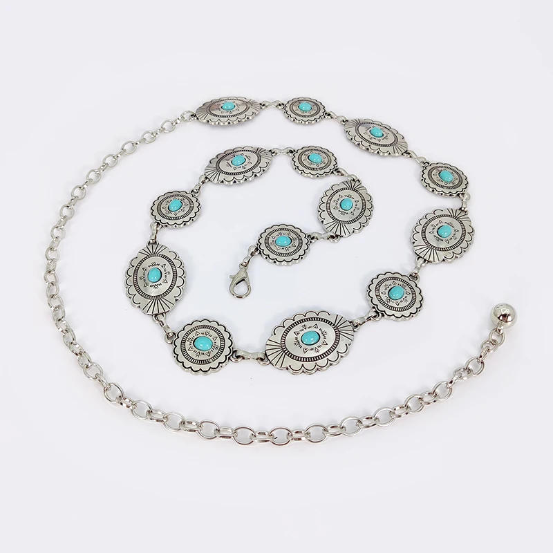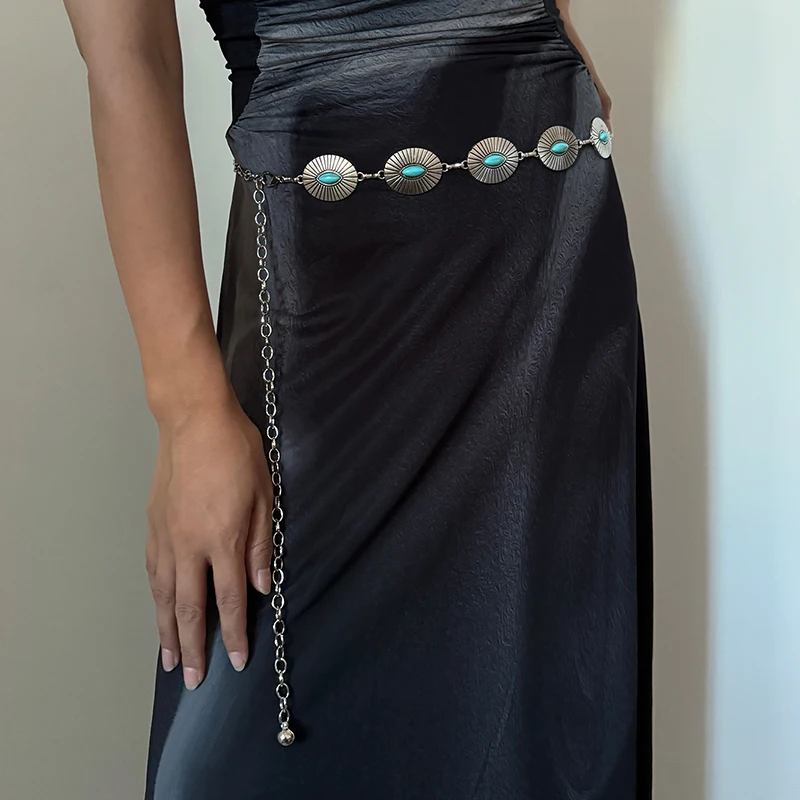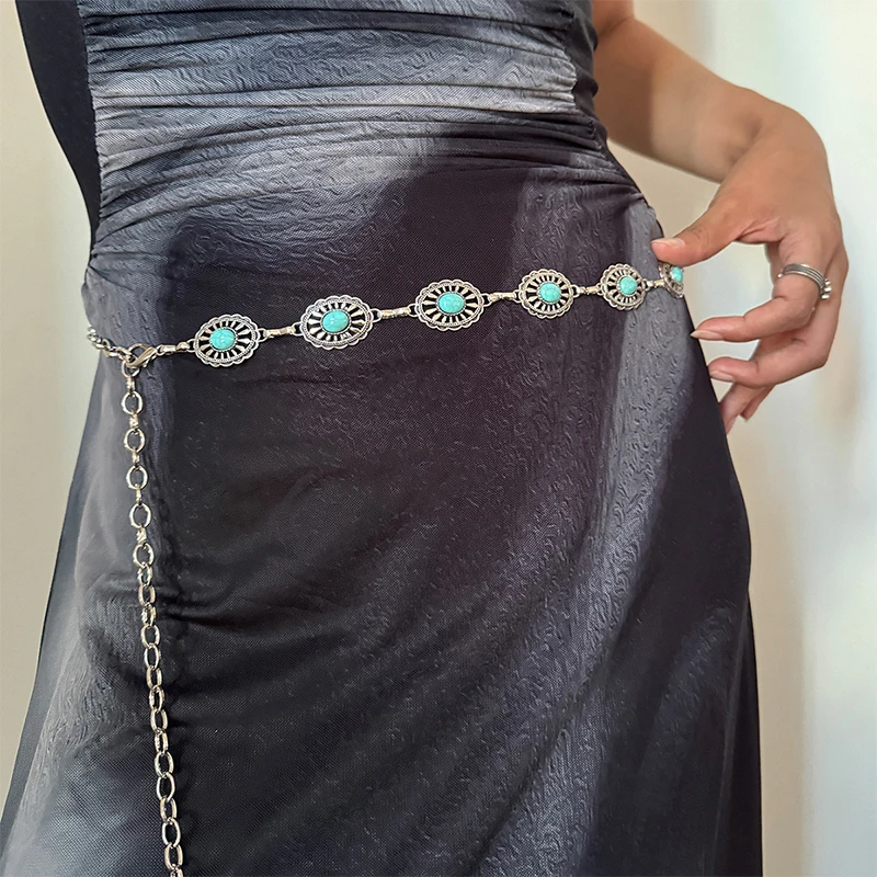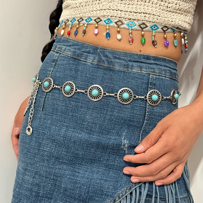 Fashion Silver Bohemian female circular waist chain luxury blue gemstone Ellipse chain belts for women suitable for Skirts dress