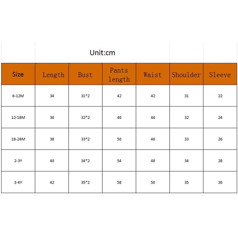 6-12M Tops Length: 34Bust: 62Sleeve: 22Shoulder: 31Pants Length: 42Waist: 42 Advised Age: 6-12 Months