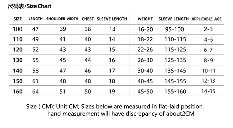 size_info: {"sizeInfoList":[{"length":{"cm":"38","inch":"14.96"},"size":"3-4Y (100CM)","vid":-1},{"length":{"cm":"40","inch":"15.75"},"size":"4-5Y (110CM)","vid":-2},{"length":{"cm":"43","inch":"16.93"},"size":"6-7Y (120CM)","vid":-3},{"length":{"cm":"44","inch":"17.32"},"size":"8-9Y (130CM)","vid":-4},{"length":{"cm":"46","inch":"18.11"},"size":"10-11Y (140CM)","vid":-5},{"length":{"cm":"48","inch":"18.90"},"size":"12-13Y (150CM)","vid":-6},{"length":{"cm":"50","inch":"19.69"},"size":"14-15Y (160CM)","vid":-7}]}
