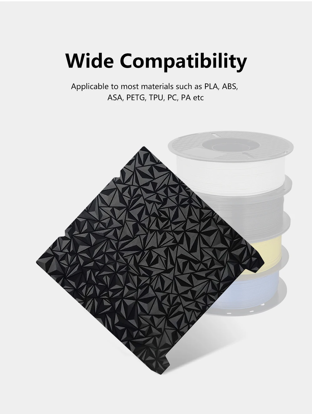 4. we suggested printing temperature: PLA 60℃ PETG 70-80℃ ABS 90-100℃.