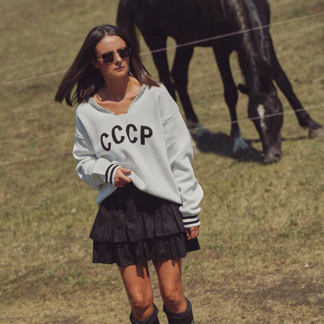 Color: Red, Size: L - JHJN Autumn V-Neck Sweater Women Patchwork Letter Streety Tops Loose Casual Pullovers Long-Sleeved Knitted Shirts Women Sweater