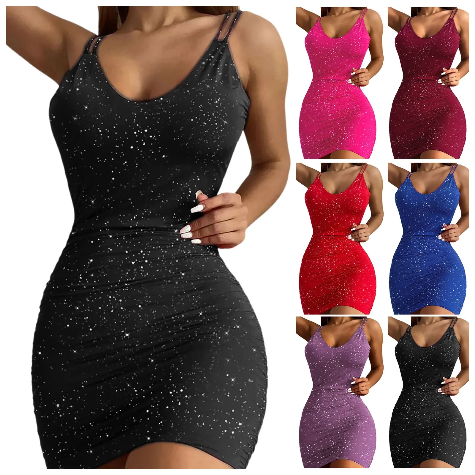 Color: Red, Size: L, Ships From: CN - Elegant Women's Party Dresses 2024 Summer Fashion Gold Sprinkled V-Neck Tight Vest Dress Sexy Women's Evening Dress Midi Dresses