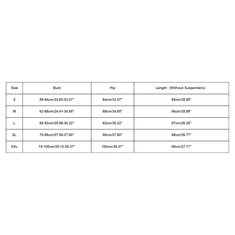 | Size:S | Bust:58-84cm/22.83-33.07'' | Hip:84cm/33.07'' | Length(Without Suspenders):65cm/25.59'' |