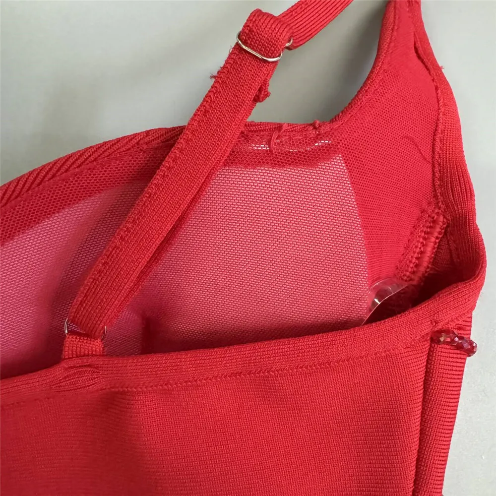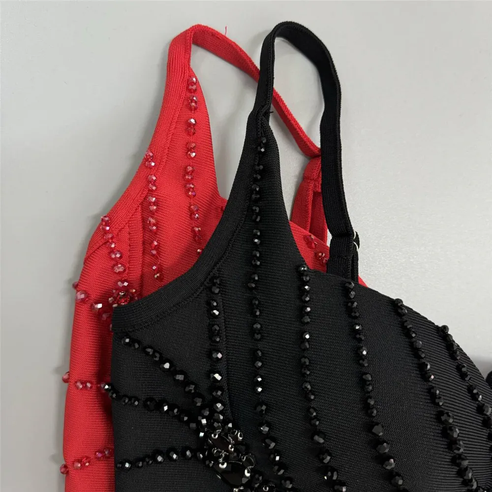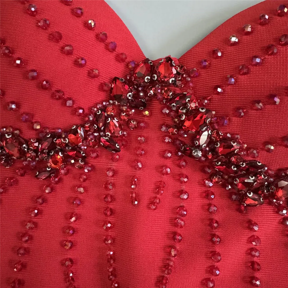 Color: Red, Size: S - Women Sexy Beading Spaghetti Strap Bandage Dress Bodycon Clothes Club Party Celebrity Elegant Dresses