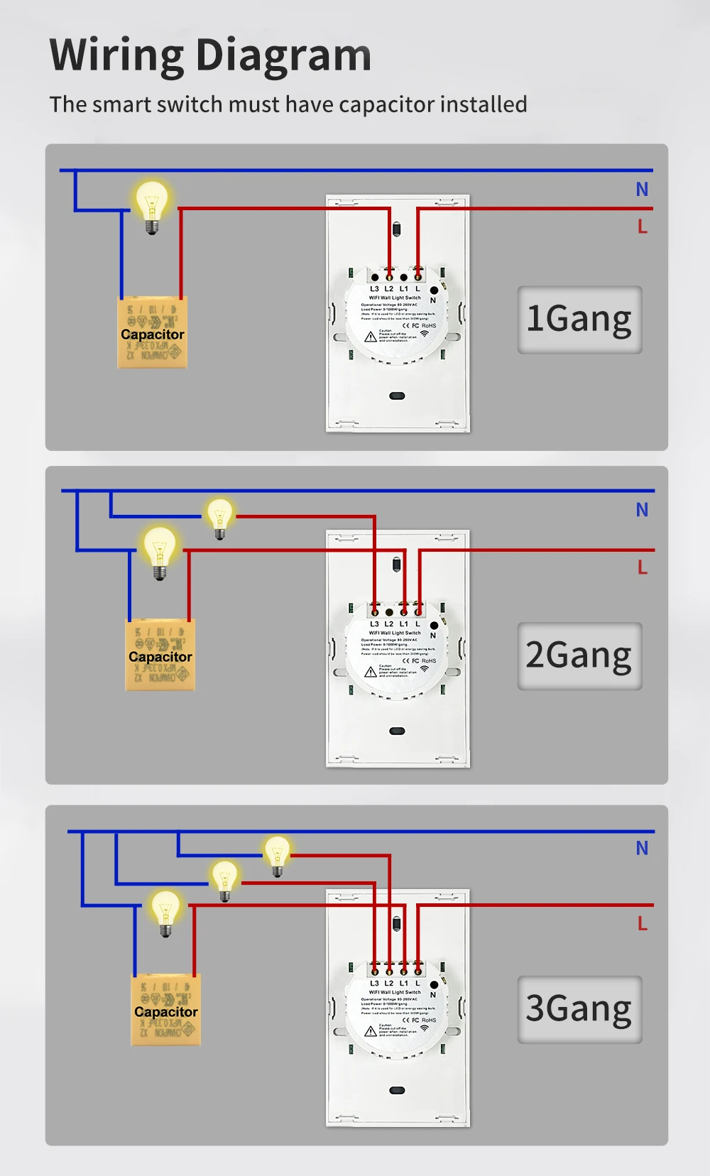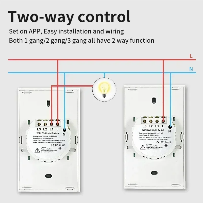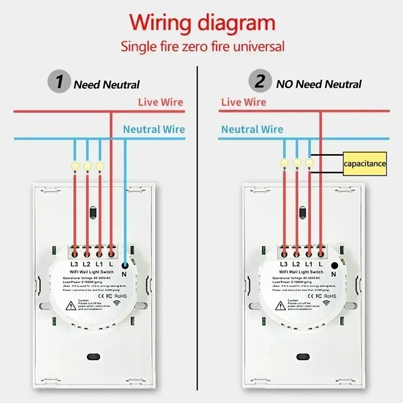 Color: Red - Tuya US WiFi+Bluetooth Smart Switches No Neutral Wire Required 1/2/3/4 Gang Light WiFi Touch Switch Work with Alexa Google Home