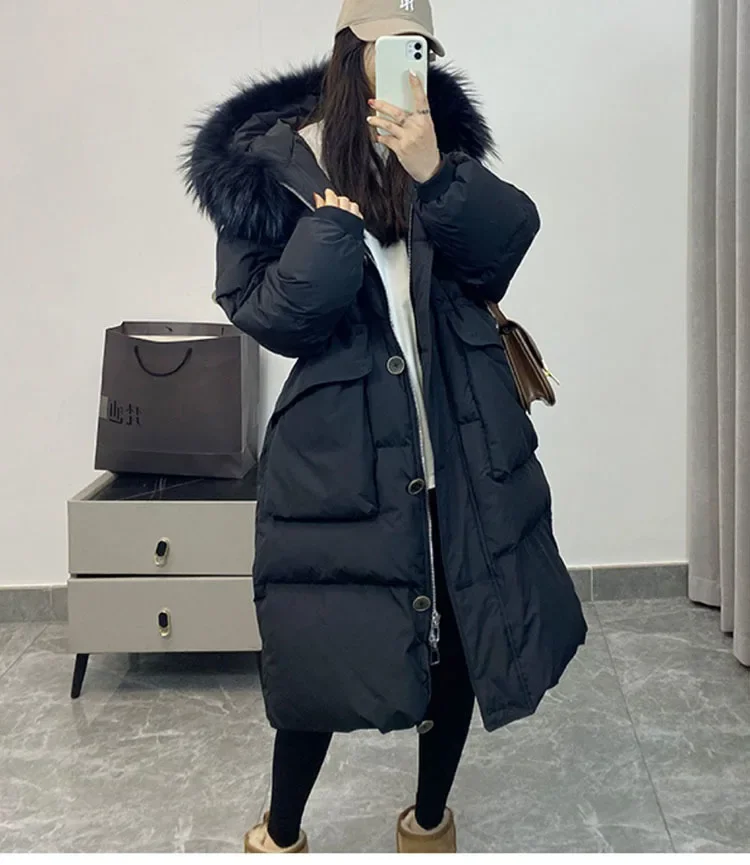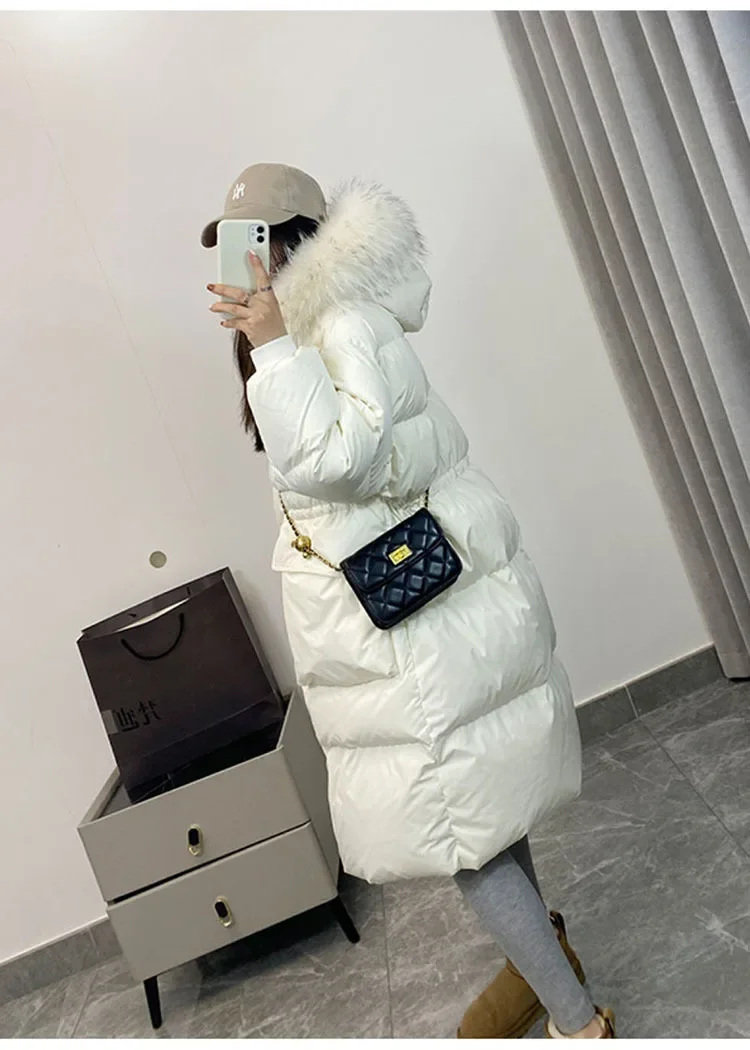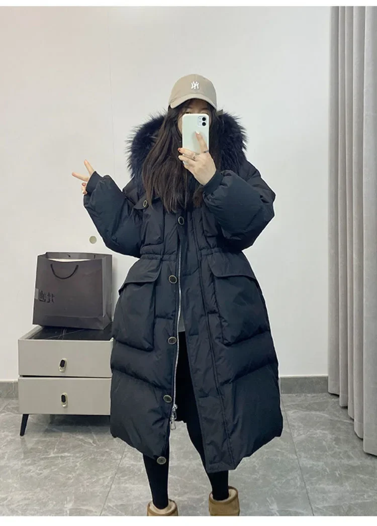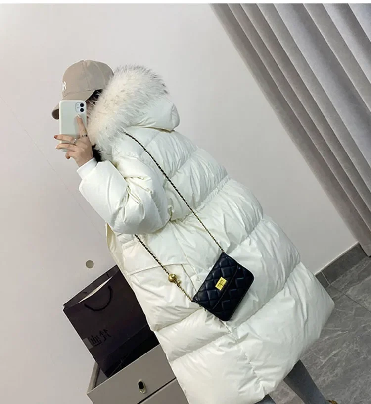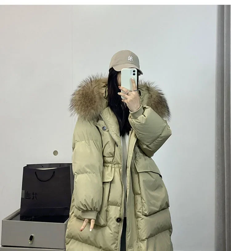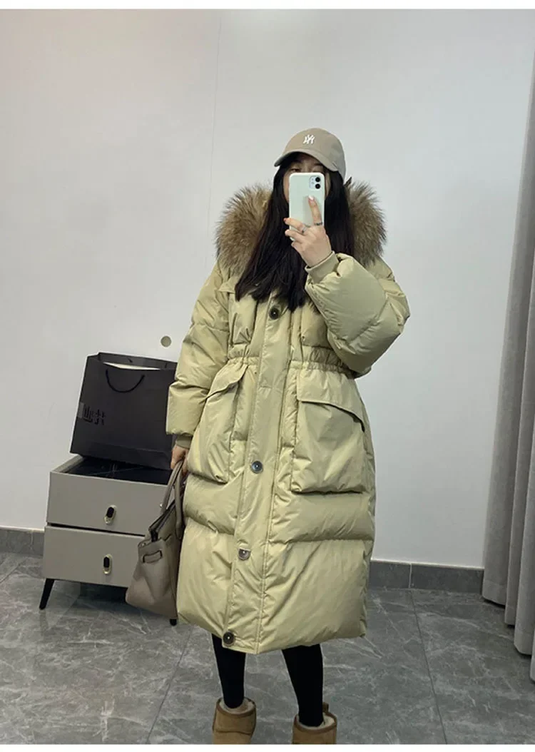 Color: RHODO, Size: M - Down Jacket Women Waterproof Winter Long Puffer Jacket 2024 Real Raccoon Fur Hooded Duck Down Coat Female Rain Feather Parkas