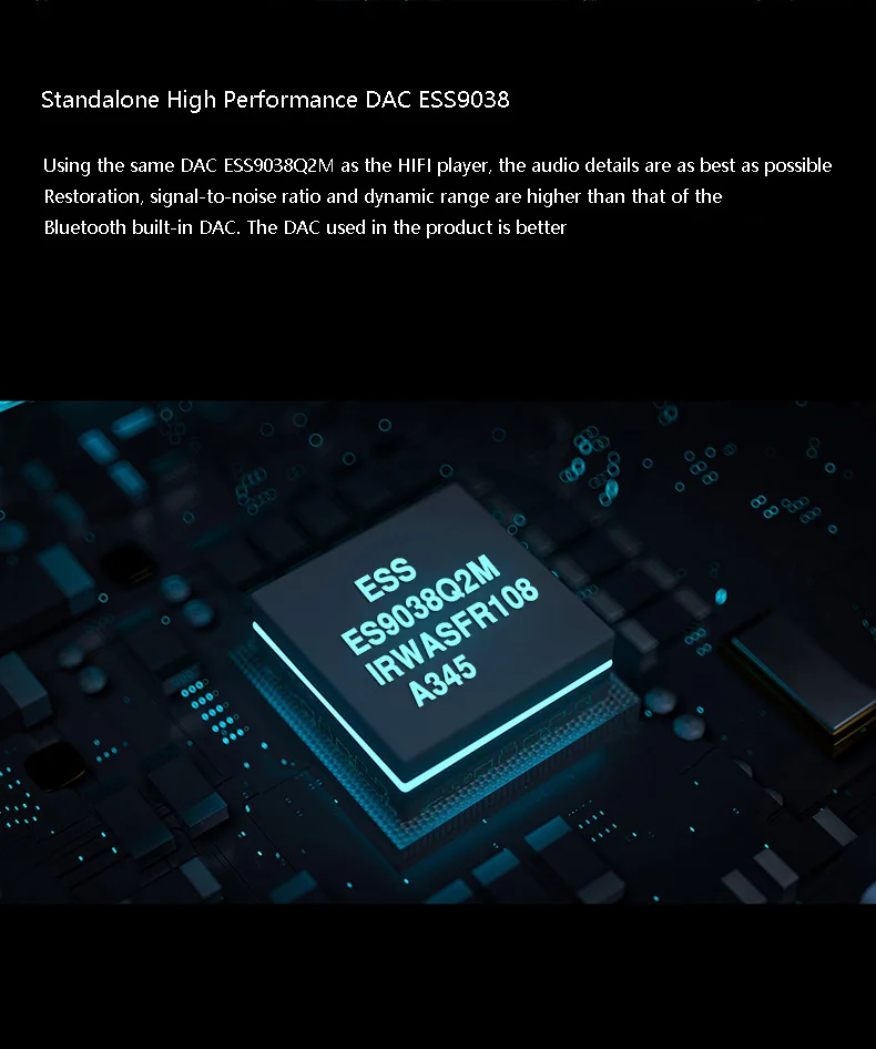 9: Using the same DAC ESS9038Q2M of the HIFI player, the audio details are restored as much as possible. The signal-to-noise ratio and dynamic range are higher than the Bluetooth built-in DAC, which is better than the DAC used by similar products.