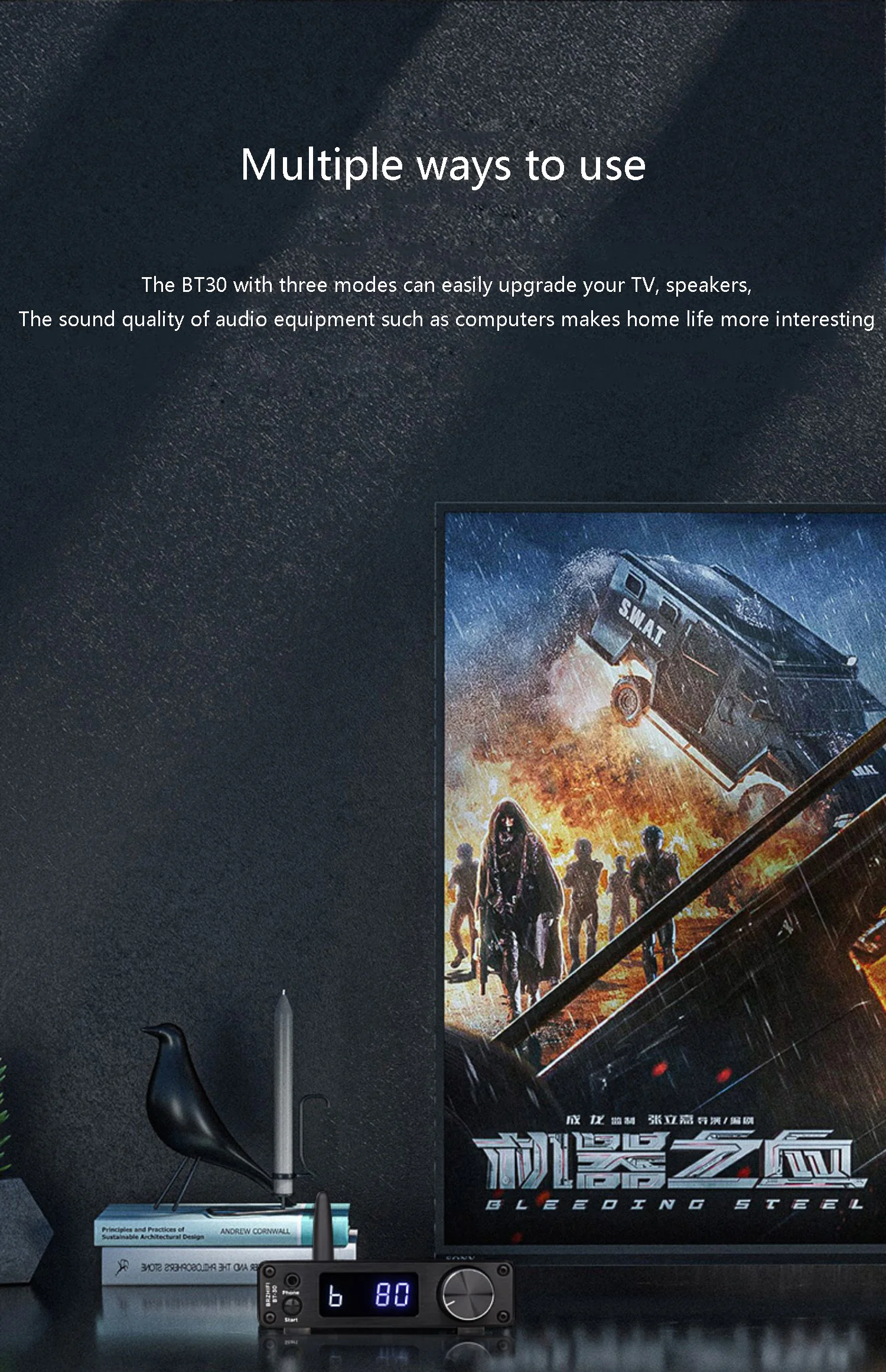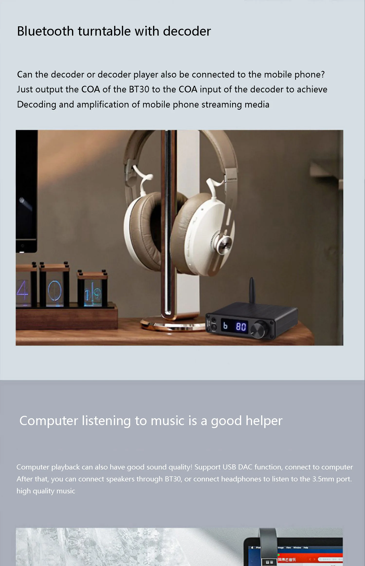 10: Support USB DAC function, after connecting to the computer, you can connect speakers through BT30, or connect headphones to the 3.5mm port to listen to high-quality music.