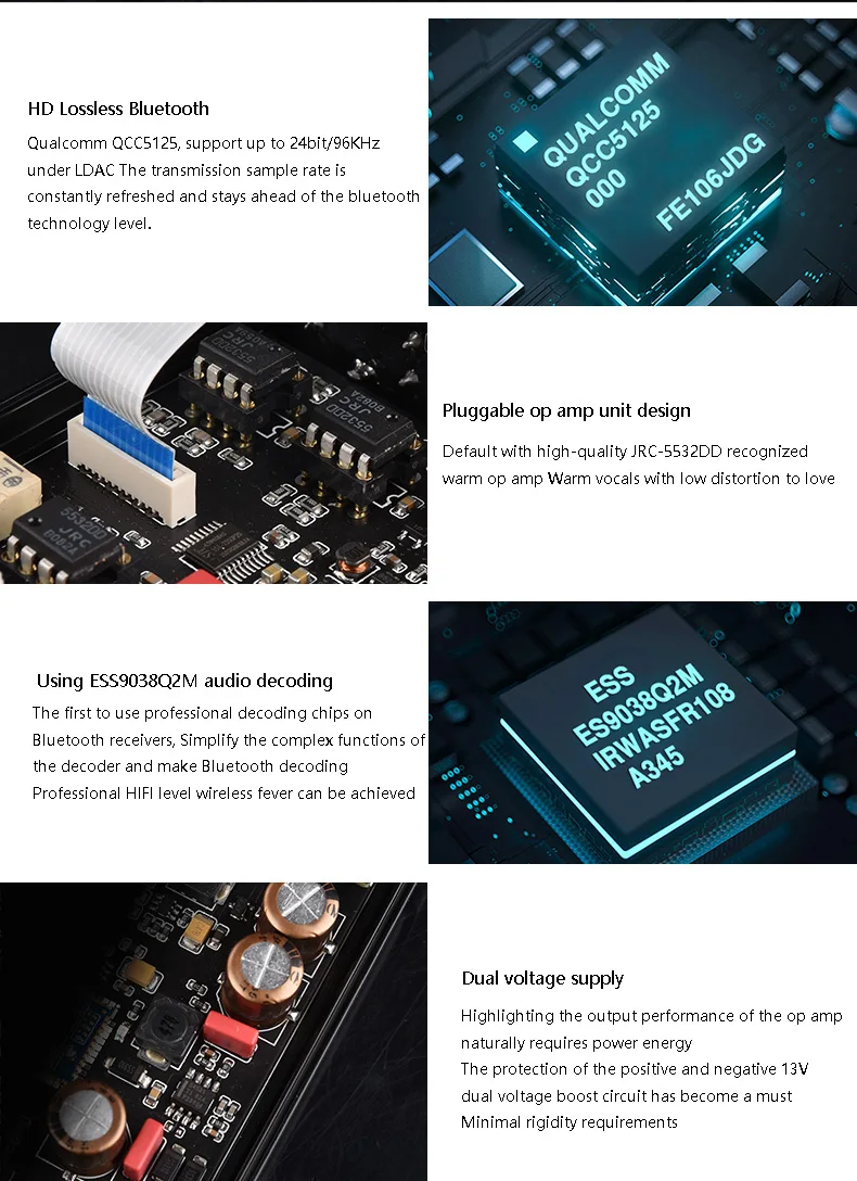 3: Using ESS9038Q2M audio decoding, the first professional decoding chip is used on the Bluetooth receiver, simplifying the complex functions of the decoder, and achieving professional HIFI level wireless fever can be achieved by Bluetooth decoding.