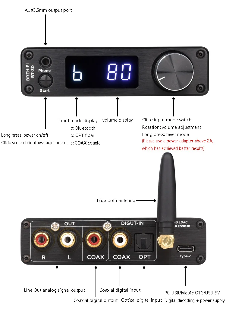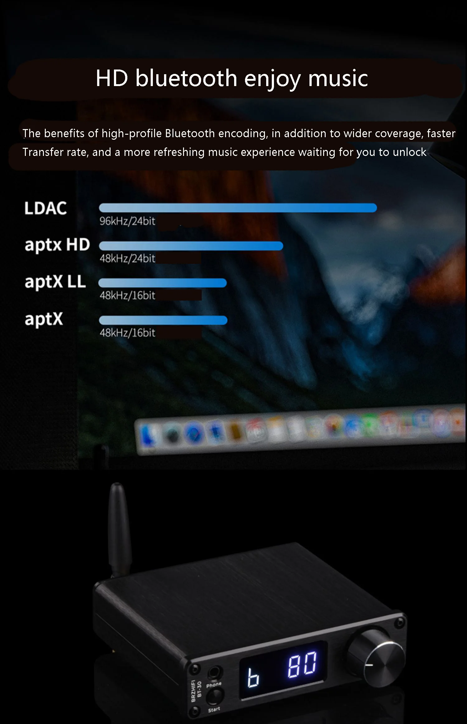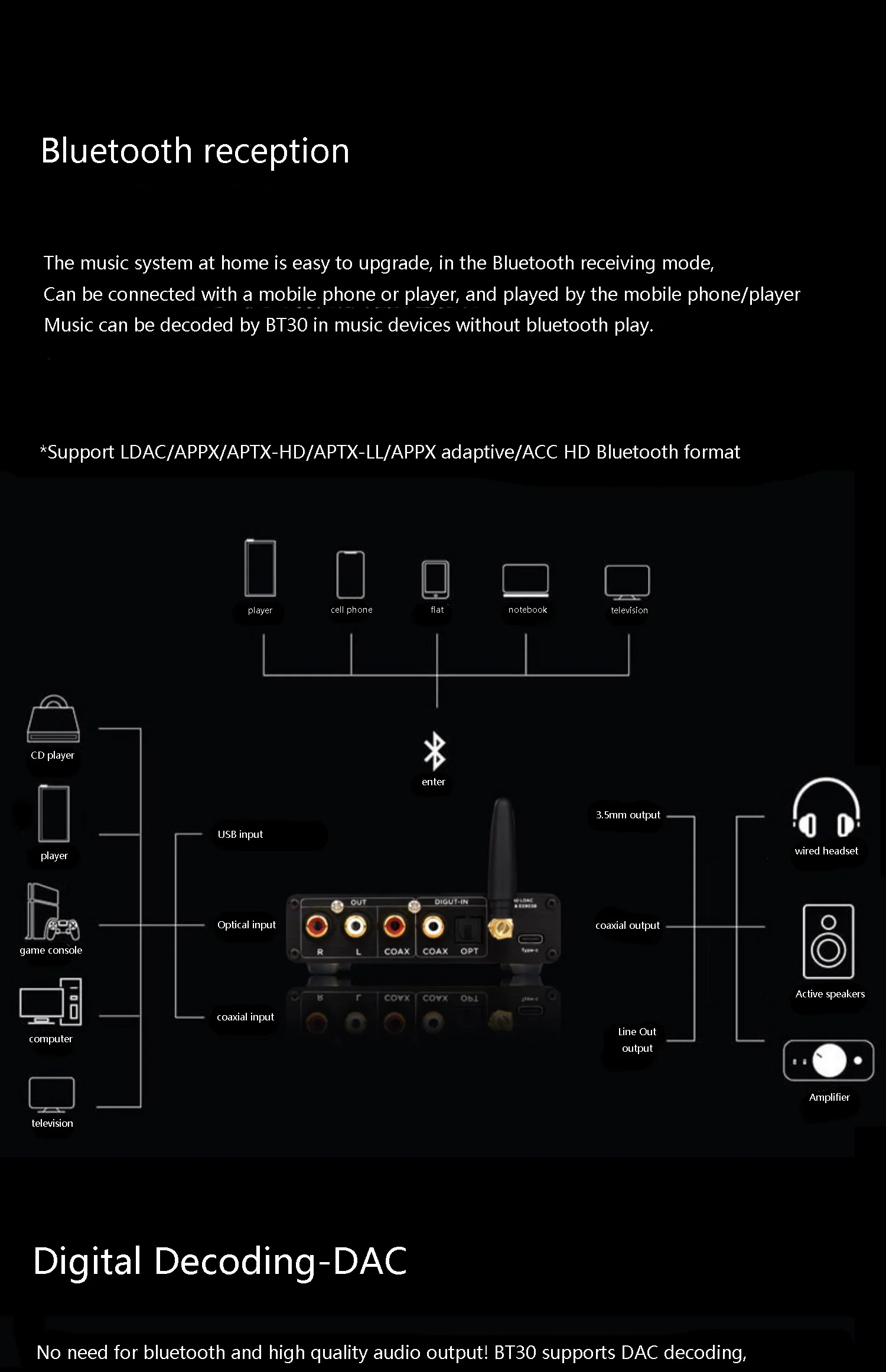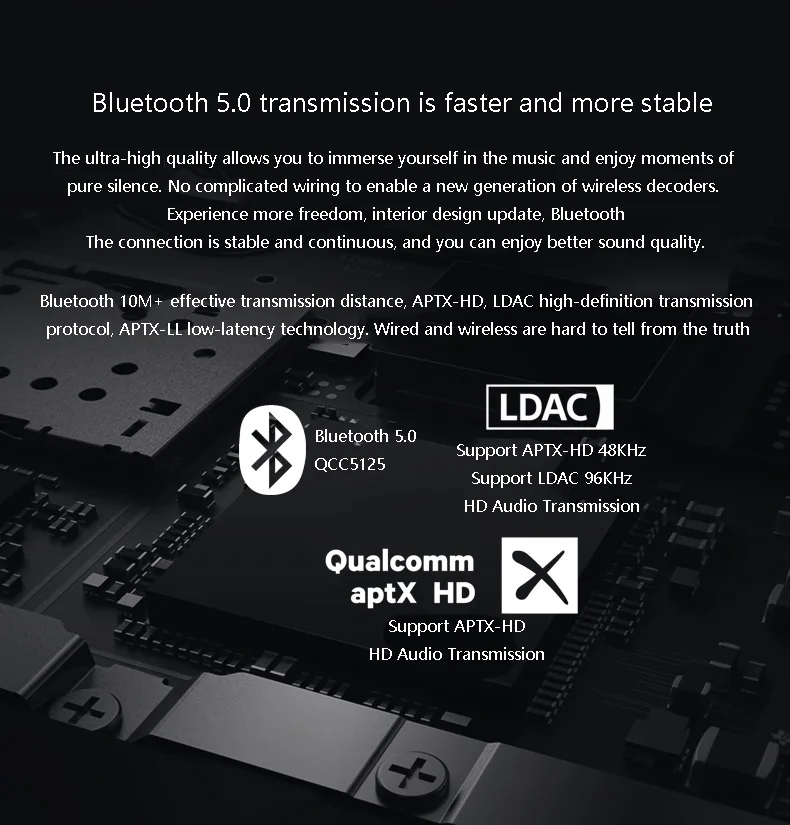 Bluetooth supported format: QCC5125/AAC/APTX/APTX-LL/APTX-HD/LDAC/APTX-ADAPTIVE (16-24bit 44.1-96KHz)