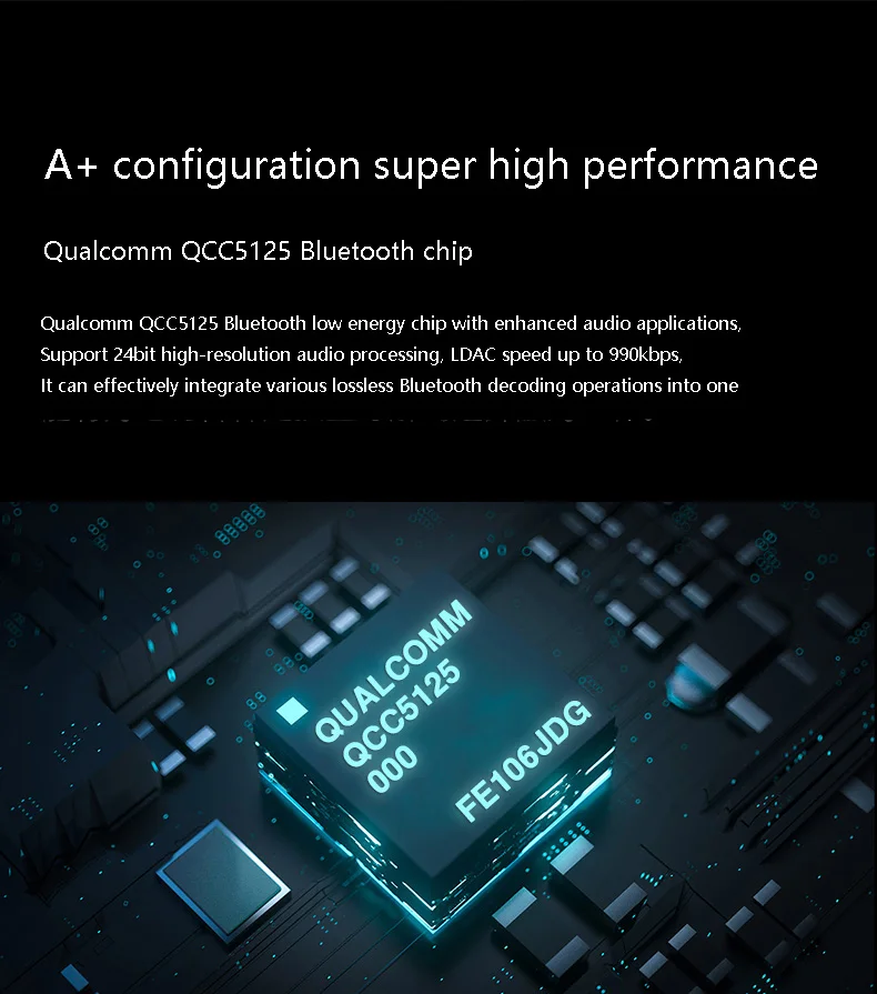 1: High-definition lossless Bluetooth, Qualcomm QCC5125, supports up to 24bit/96KHz transmission sampling rate under LDAC, constantly refreshing and maintaining the leading Bluetooth technology level.