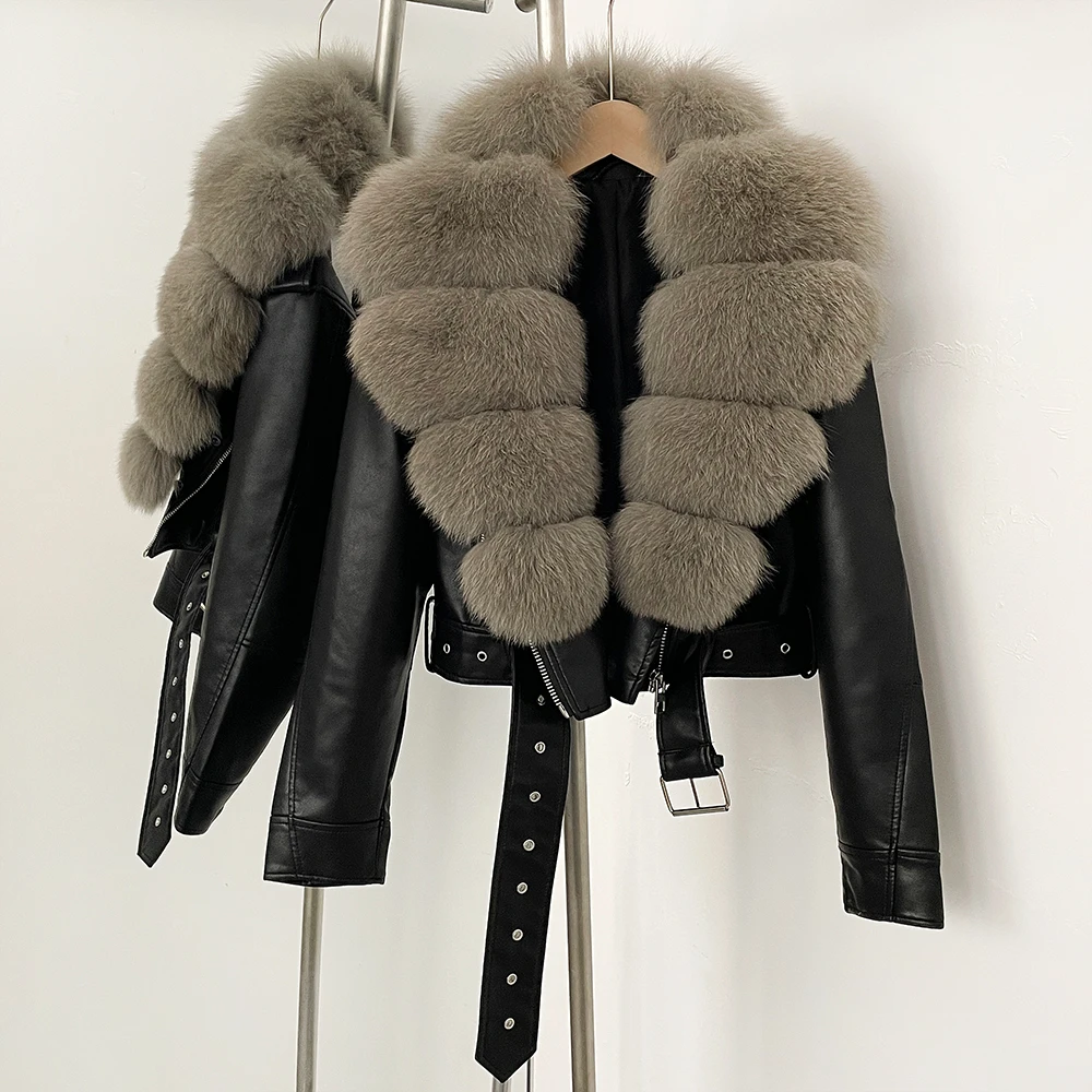 Color: Silver, Size: L - Fake Leather Coat New Natural Fox Fur Autumn Short Faux Leather Jacket Female Spring PU Women Long Sleeve Real Fur Coat Thin