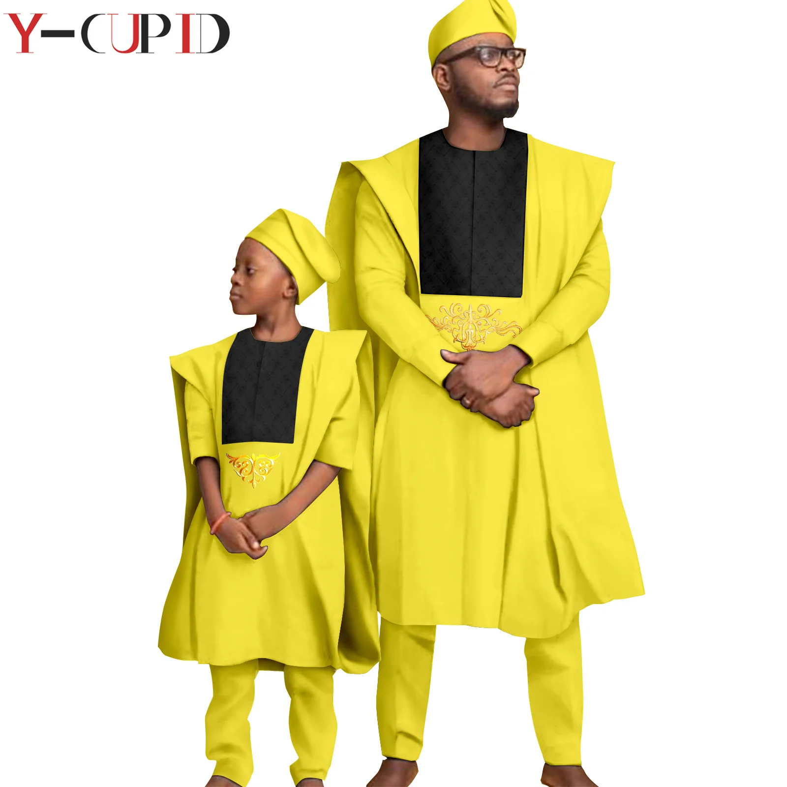 Color: Silver, Size: Mother 5XL - African Clothes for Men Top Pants Robes Hat Sets Match Kid Boy Sets Dashiki Father and Son Bazin Riche Family Outfits Y20F001