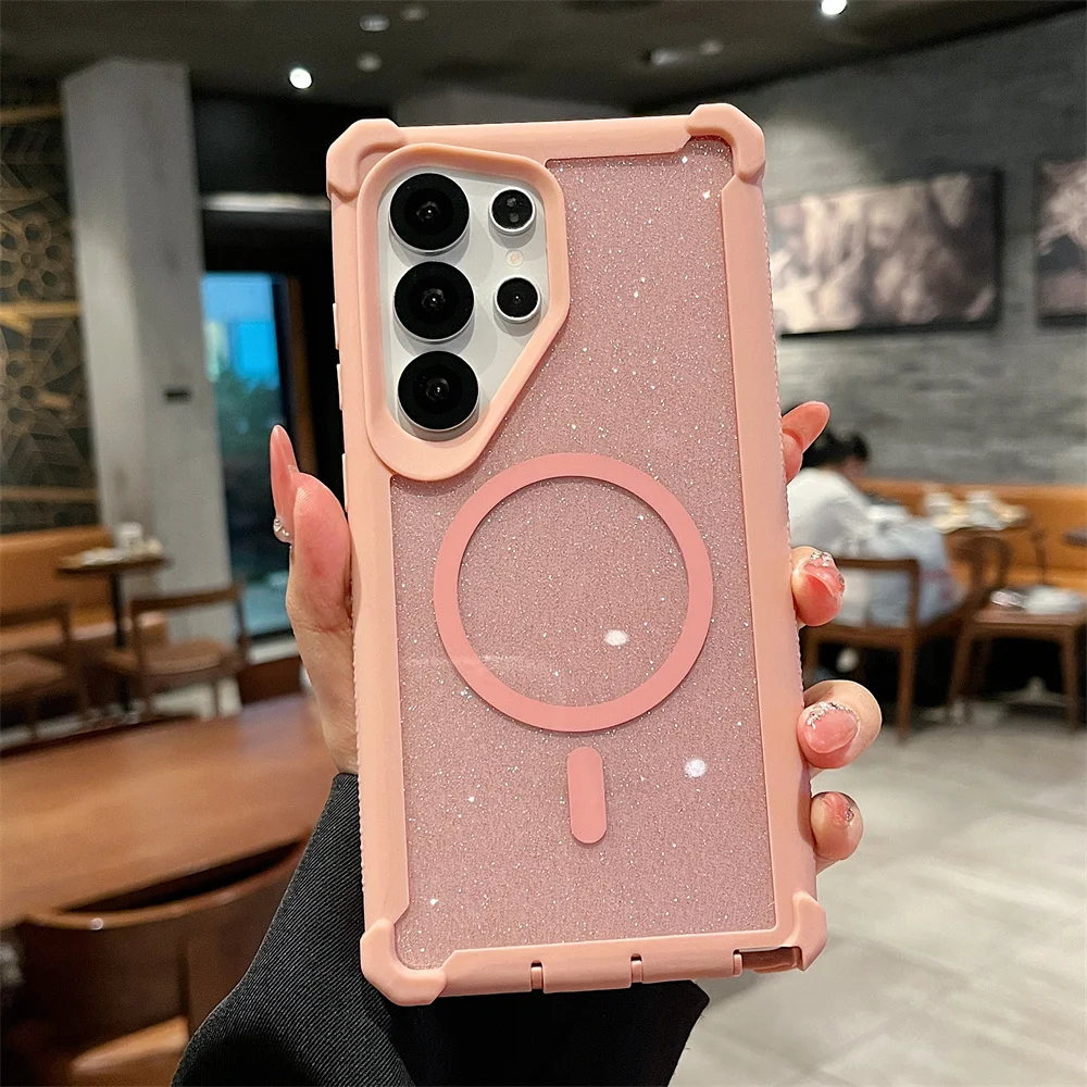 For Magsafe Clear Armor Bumper Glitter Phone Case For Samsung S25 Ultra S24 Plus Wireless Charging Shockproof Protective Cover