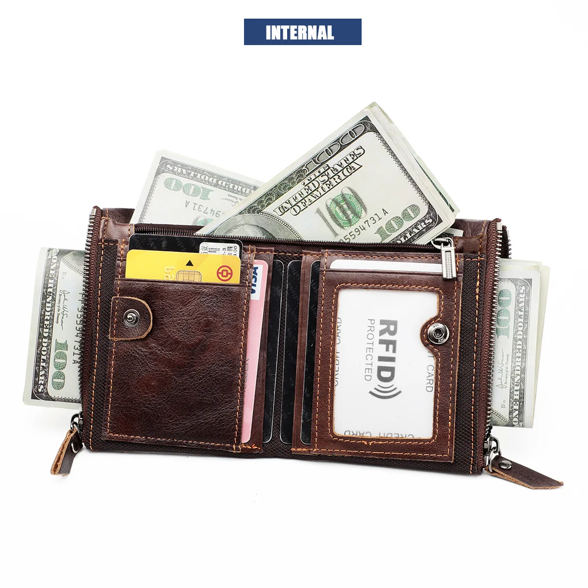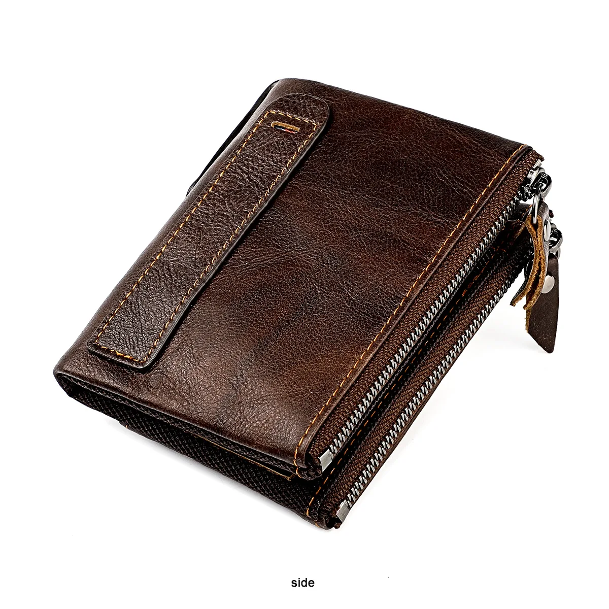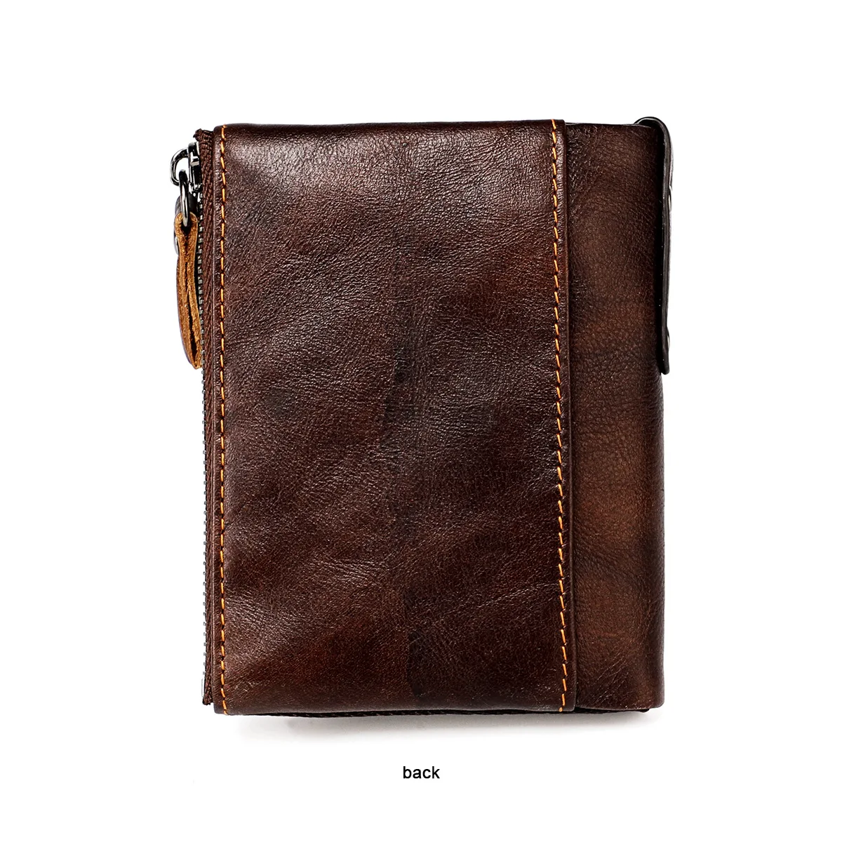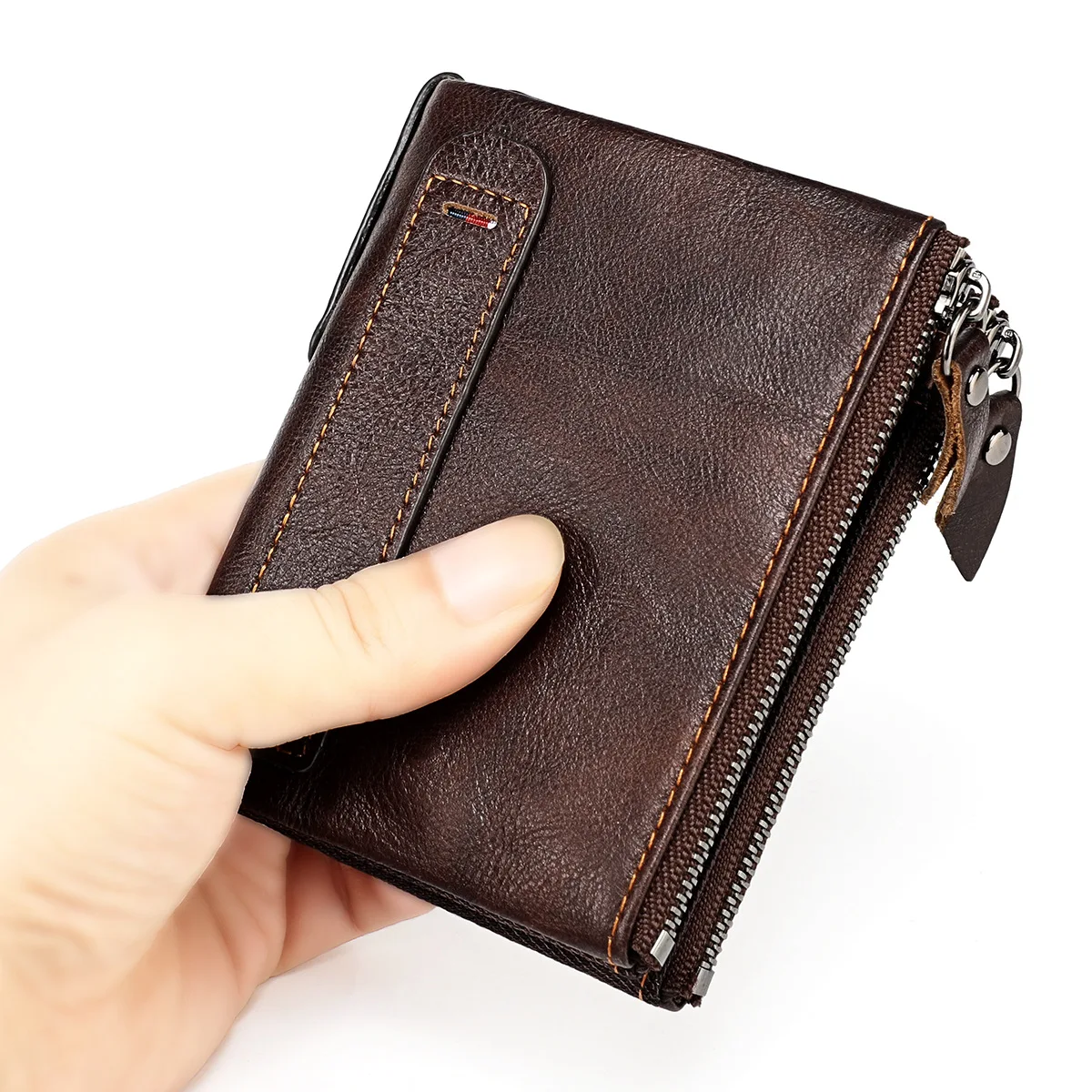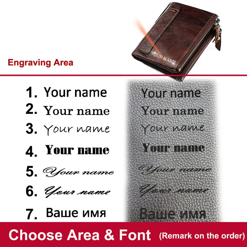 Color: SKY BLUE - Genuine Leather Short Men RFID Wallets Name Engraving Leather Card Holder Brand Men Purse Retro Coin Pocket Zipper Male Wallet
