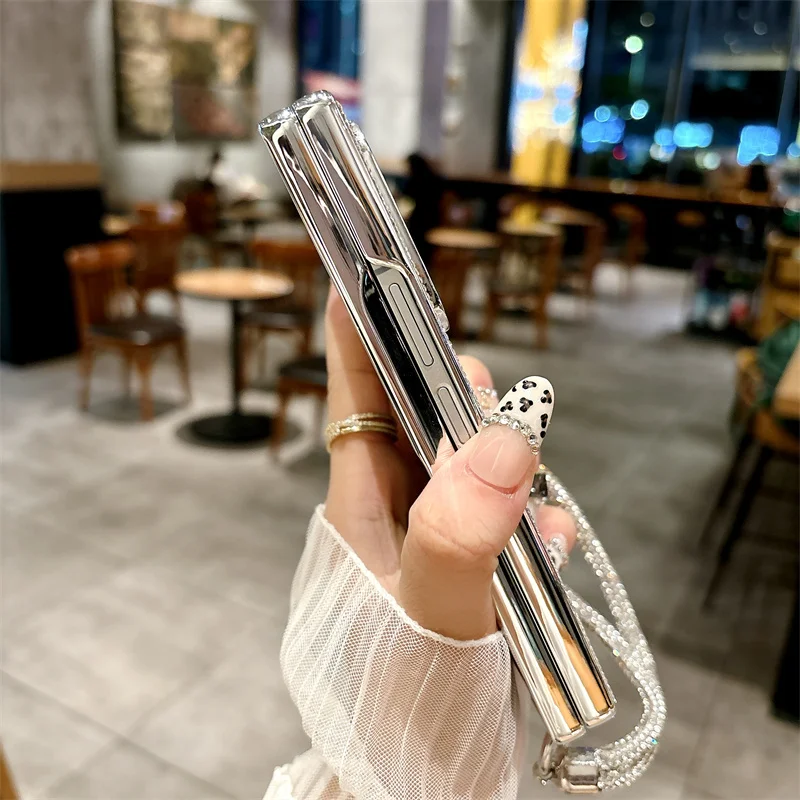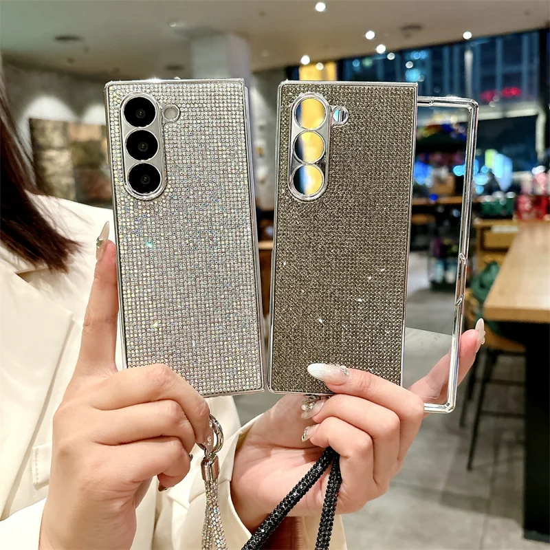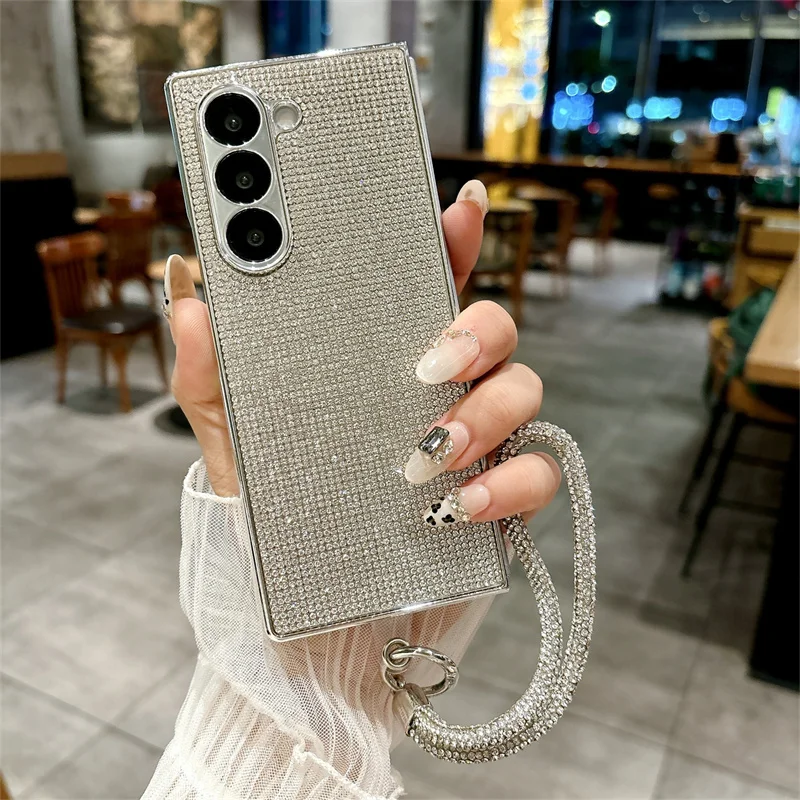 Color: SKY BLUE, Material: Denim - Luxury Flash Diamond Sparkling phone case for Samsung Galaxy Z Fold 6 5 zfold 4 Electroplated bracelet shockproof cover
