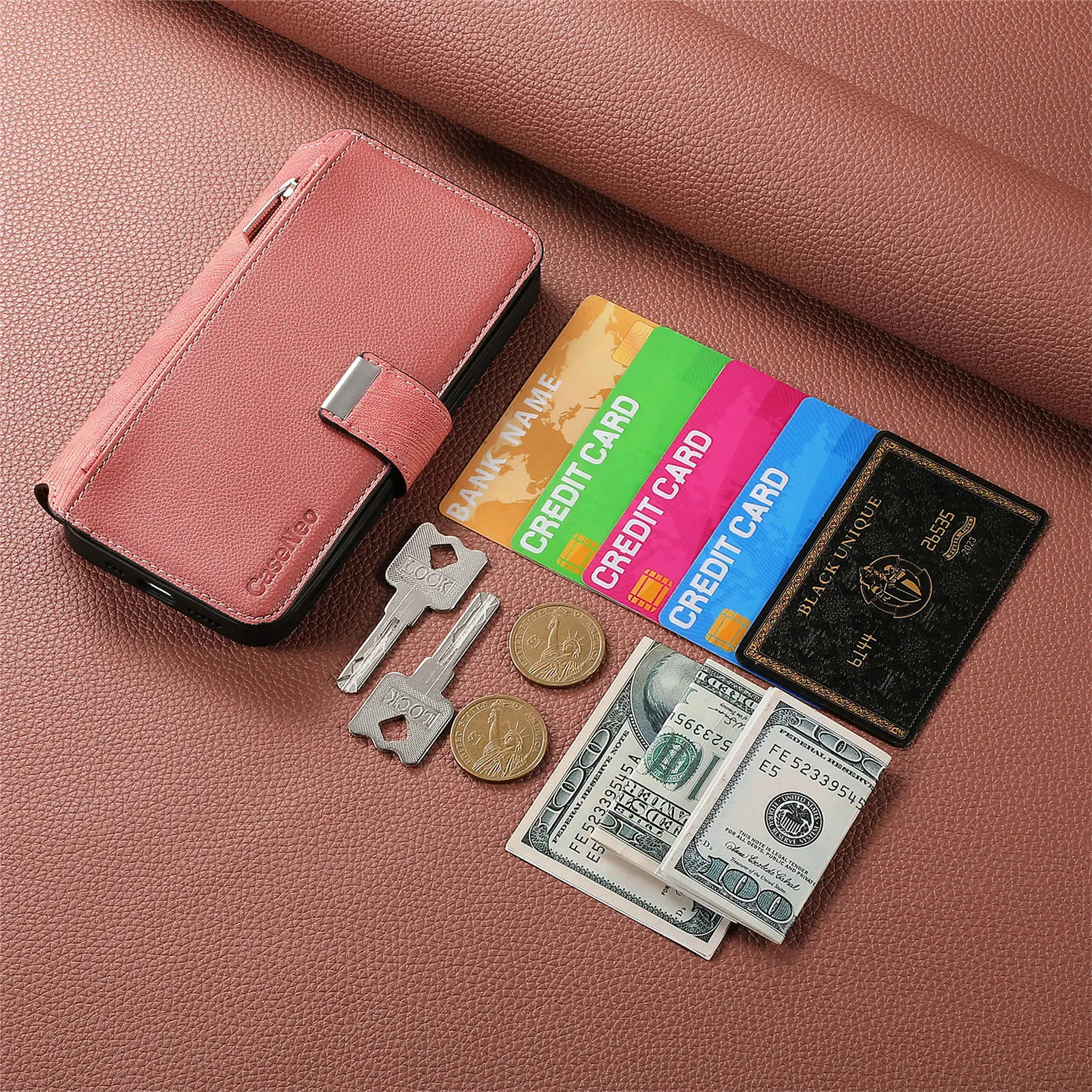 Features: Come with 6 card slots + 1 cash slots + 1 zipper pocket +magnetic closure