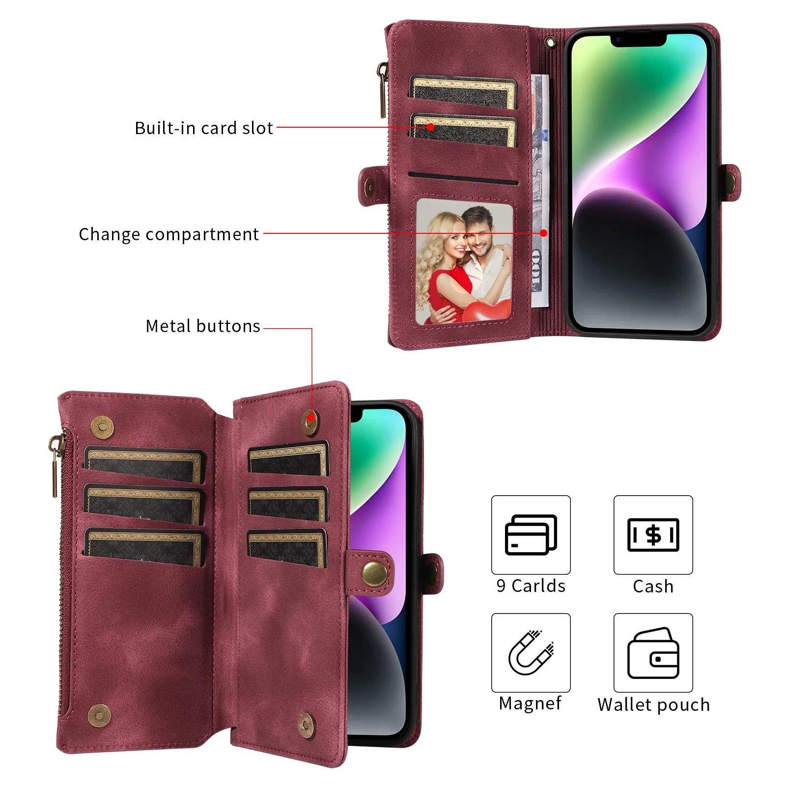 Feature 1: Zipper Wallet / flip case with 9 card slots + 1 cash slot+Zipper Pocket
