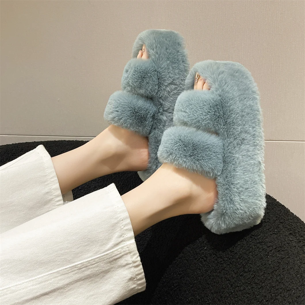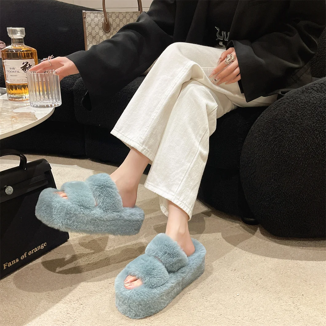 Color: SKY BLUE, Shoe Size: 38 - New Winter Open Toe Slipper Fur Thick Sole Flats Heel Ladies Casual Slip On Bedroom Shoes Soft Outdoor Fashion Fur Slippers