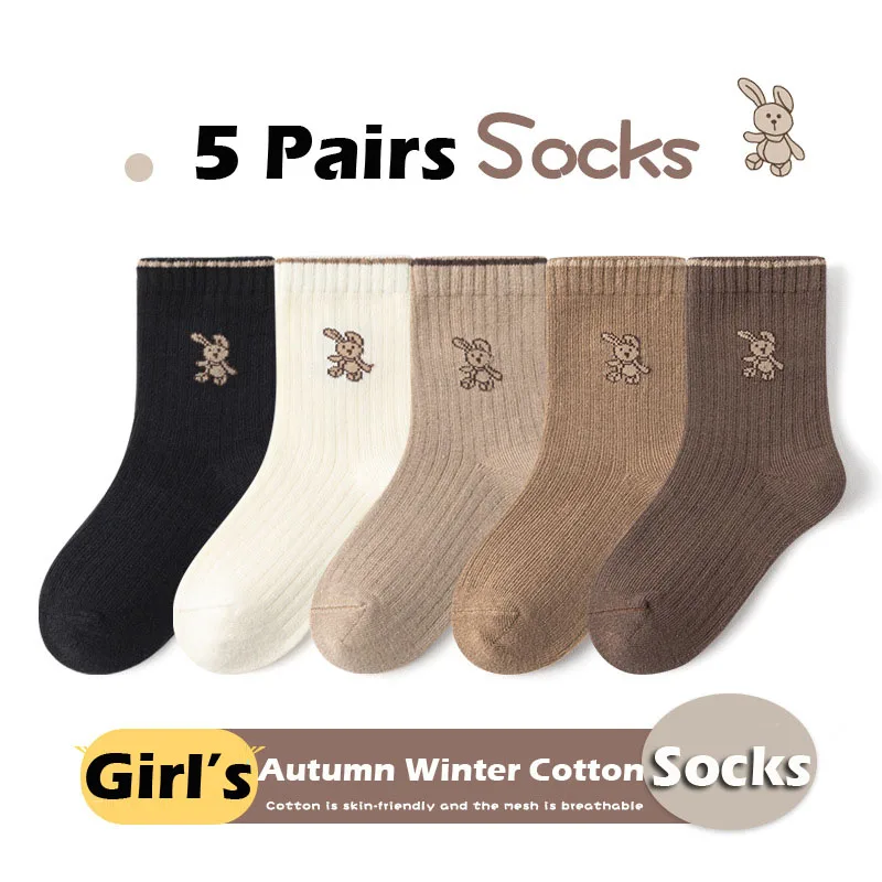 Color: SKY BLUE, Size: 2-3T - Autumn Socks Baby 5 Pairs Cartoon Bunny Pattern Socks Girls Calf Length Children Socks Solid Cotton Socks