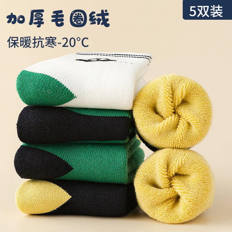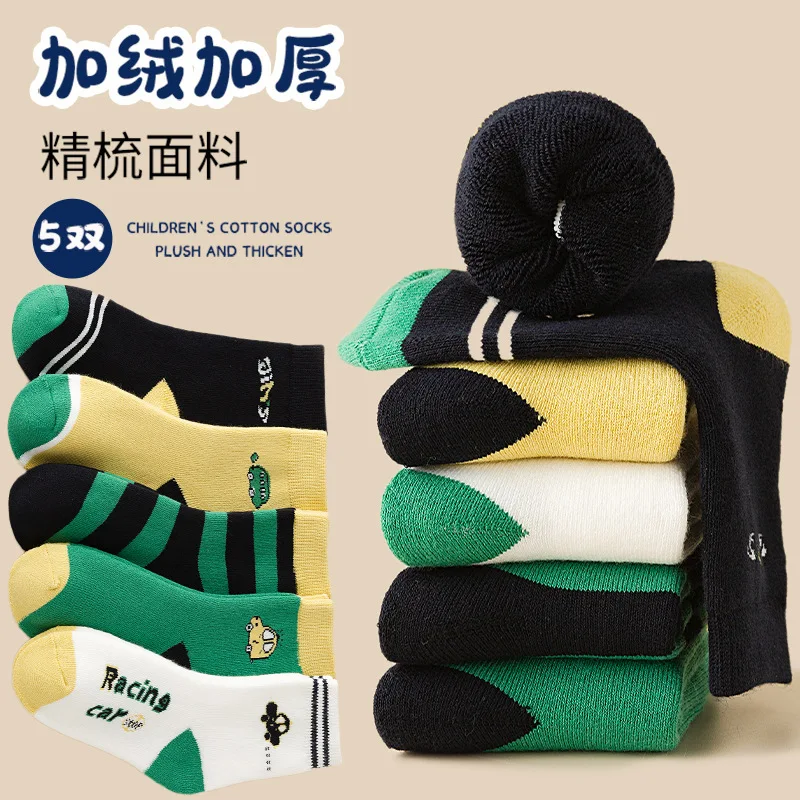 Color: SKY BLUE, Size: 7-9T - Children's Winter Socks 5 Pairs Student's Thick Cotton Socks Boys Warm Winter Socks Cartoon Racing Car Pattern