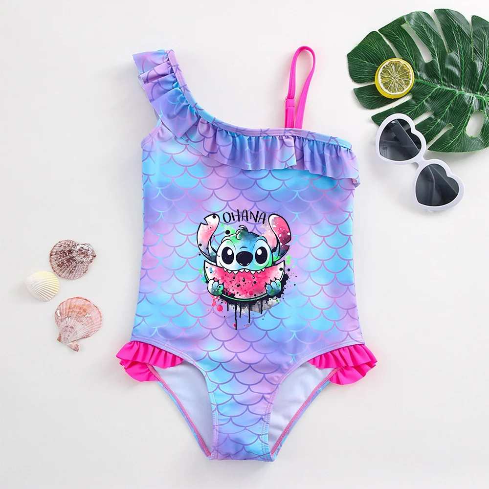 One-piece girls swimsuit, fish scales Designed with a cute ruffle hips.