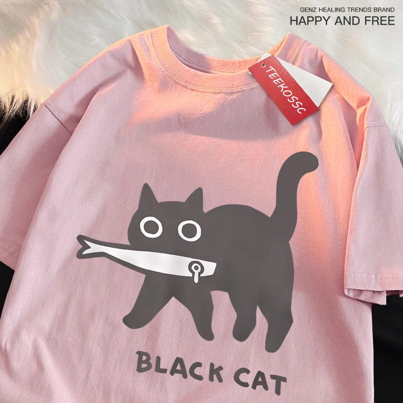 Color: SKY BLUE, Size: S - Fun A Black Cat Eating Fish Japanese Style Men Women T-Shirt Fashion Print T Shirt Breathable Oversize T-Shirts Cotton Clothes