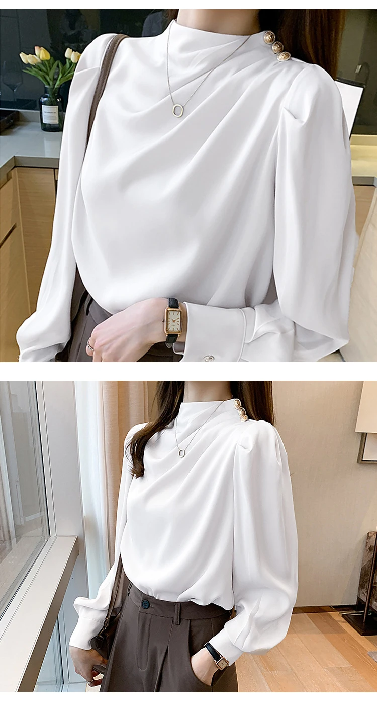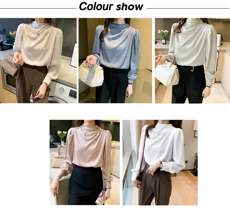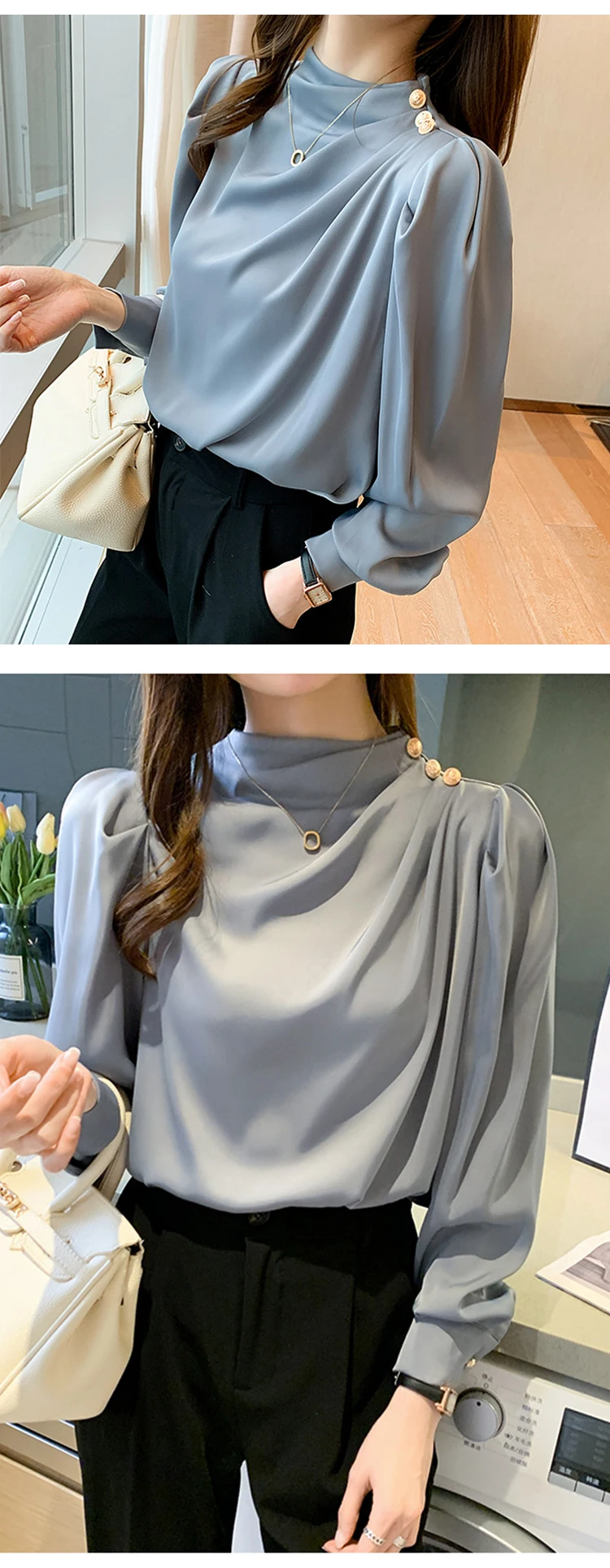 Color: SKY BLUE, Size: XL, Ships From: CHINA - Spring Autumn Elegant Office Women Shirt Mujer Chic Satin Formal Lantern Sleeve Blouse Tops Loose Pullover Jumper Street Clothes