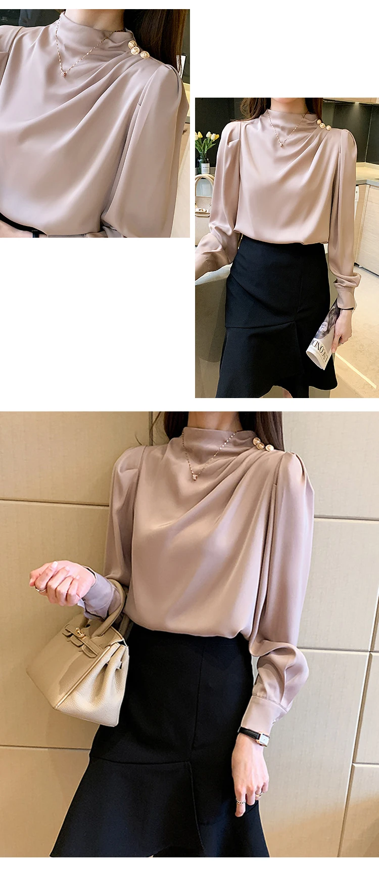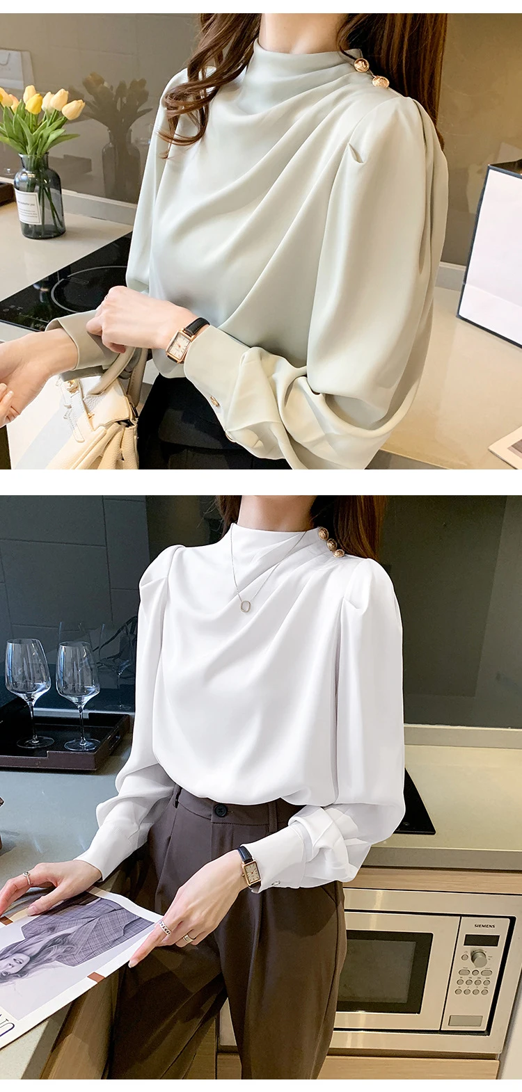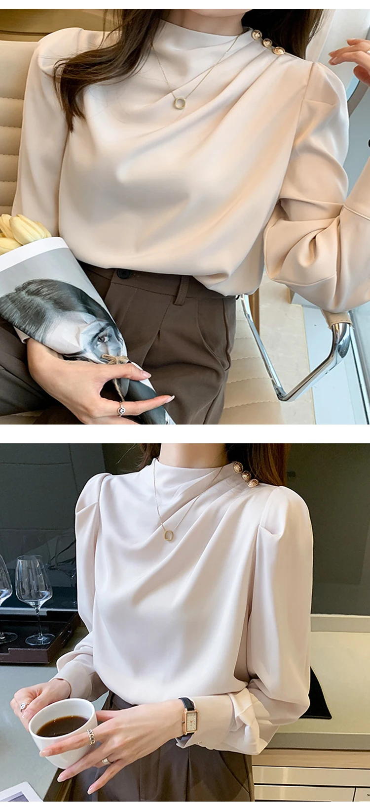 Color: SKY BLUE, Size: XL, Ships From: CHINA - Spring Autumn Elegant Office Women Shirt Mujer Chic Satin Formal Lantern Sleeve Blouse Tops Loose Pullover Jumper Street Clothes