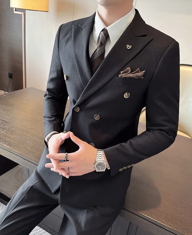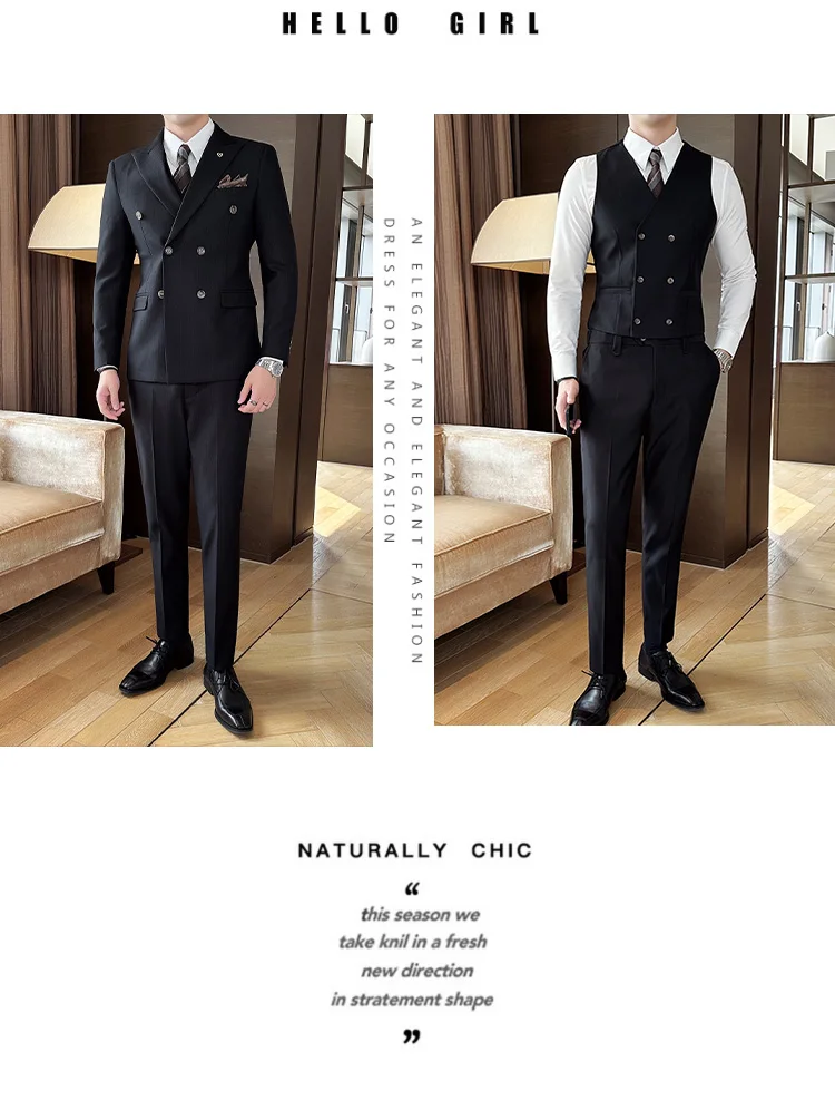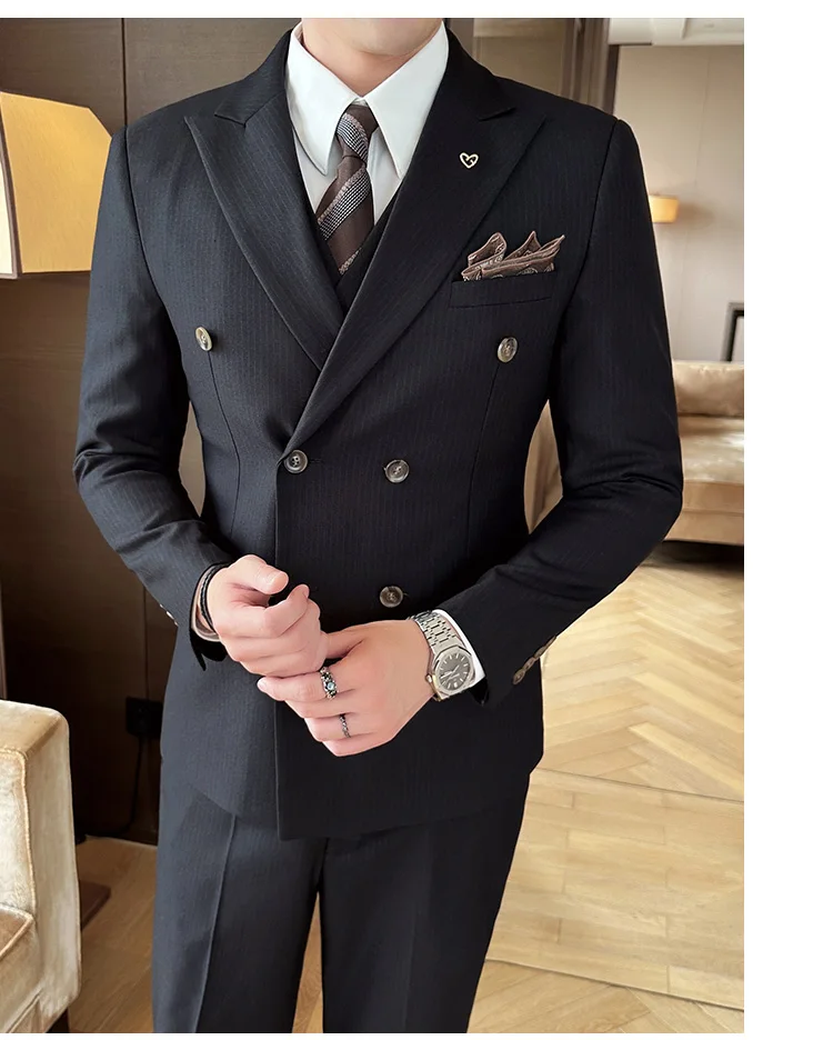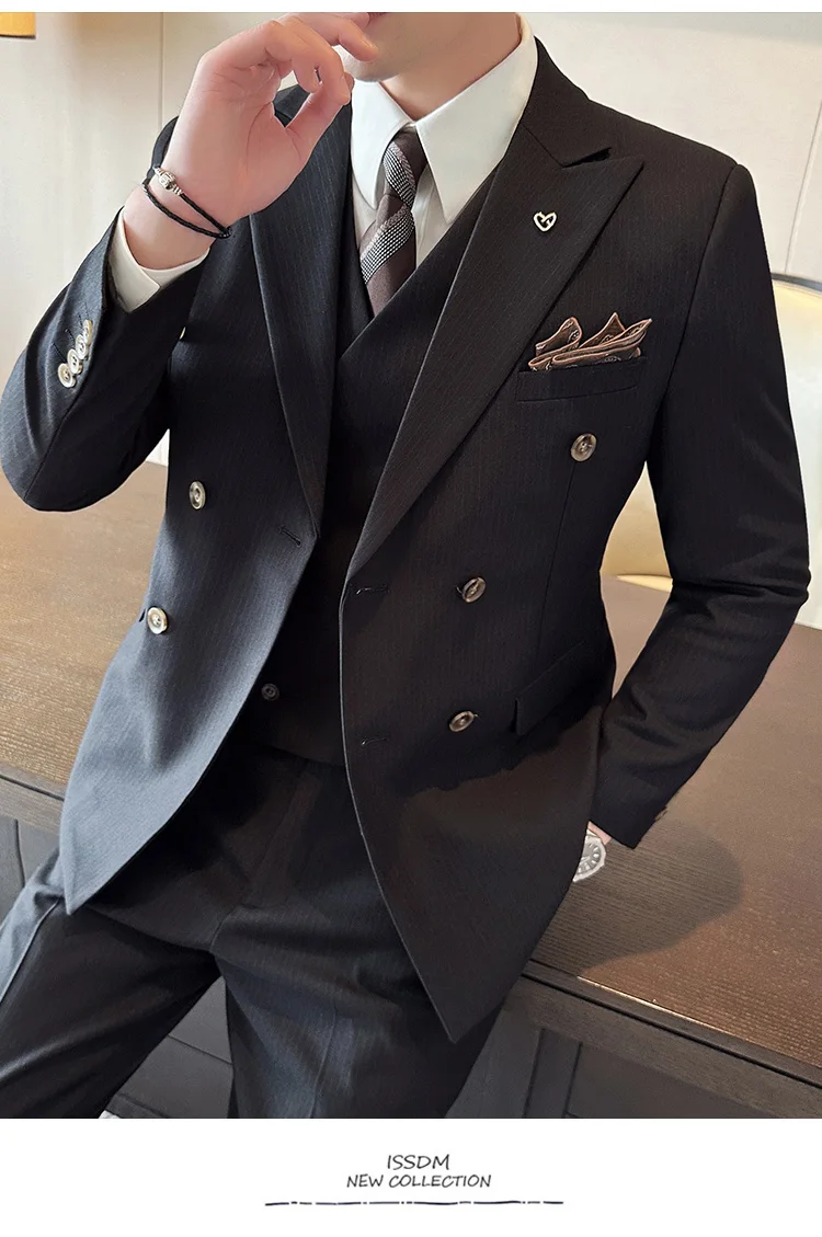 Color: SKY BLUE, Size: XXL - 2025 Men's Double Breasted 3/2 Piece Business Casual Wedding Dress Suit with Trousers Regular Fit Bridegroom High Sense