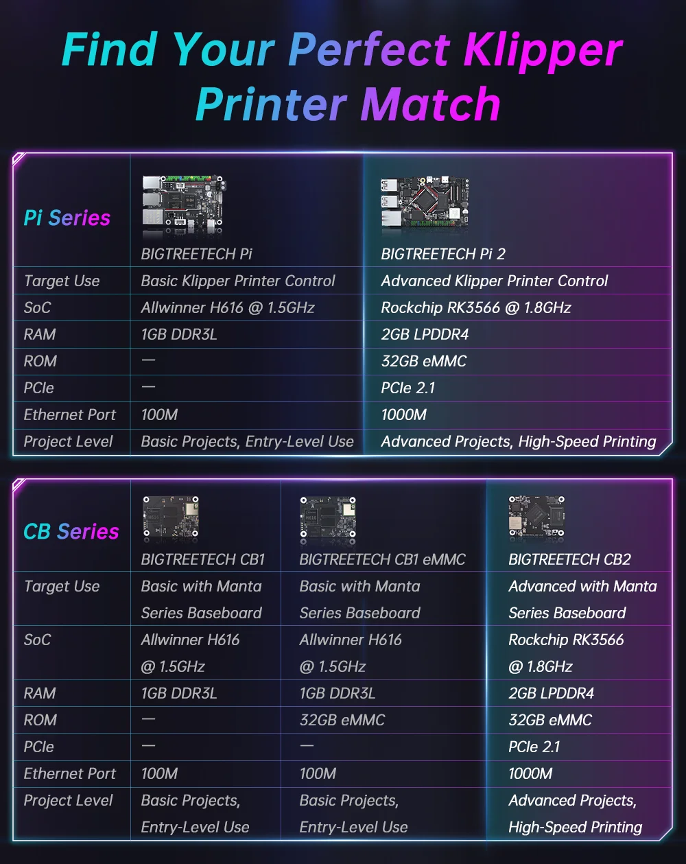 With a lightning-fast RK3566 processor running at up to 1.8GHz, the BIGTREETECH Pi 2/CB2 takes Klipper printing performance to unprecedented heights. Say goodbye to sluggish response times and say hello to buttery-smooth operation.