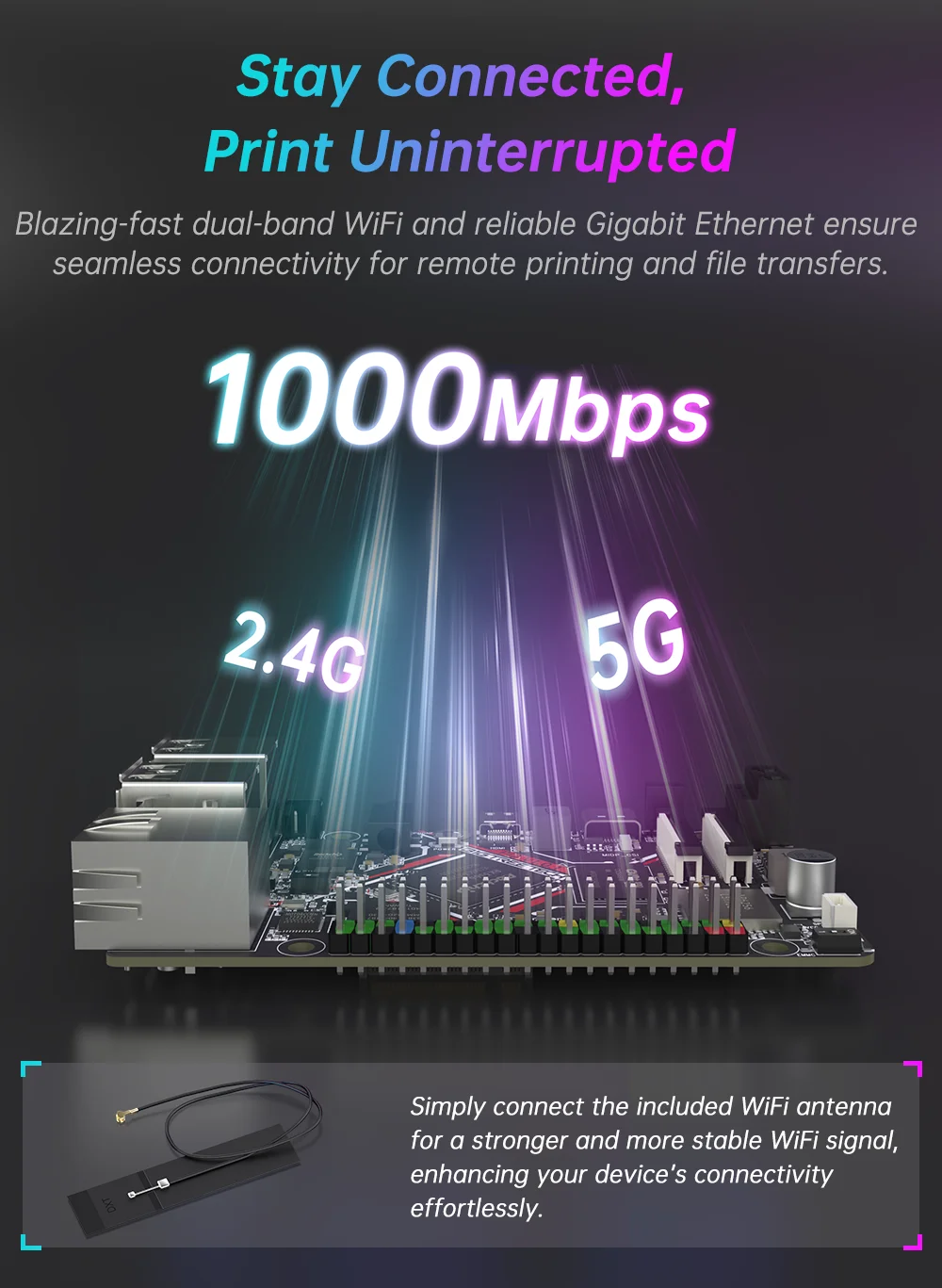 Blazing-fast dual-band WiFi and reliable Gigabit Ethernet ensure seamless connectivity for remote printing and file transfers.