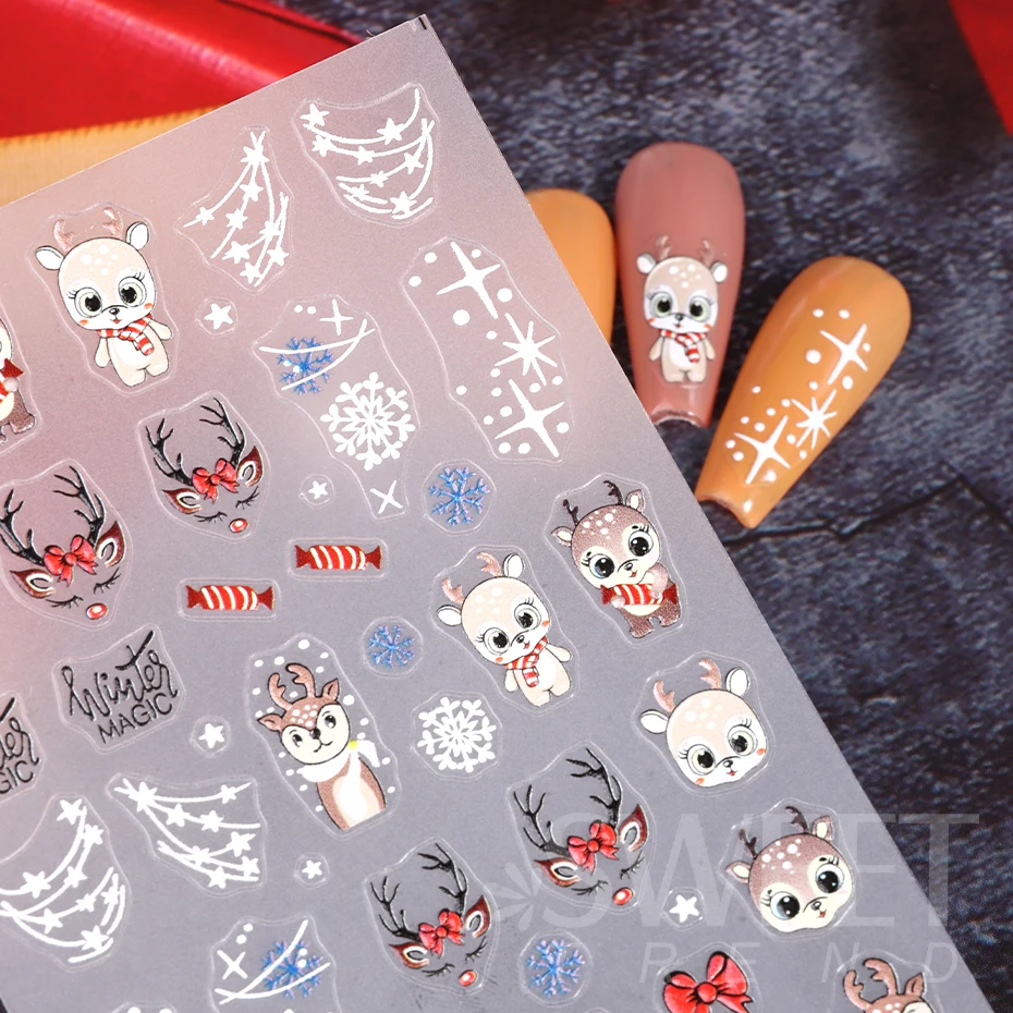 Color: WHITE - 5D Embossed Elk Nail Art Sticker Cute Christmas Winter Santa Claus Snowflake Gingerbread Man Engraved Slider Manicure Decoration