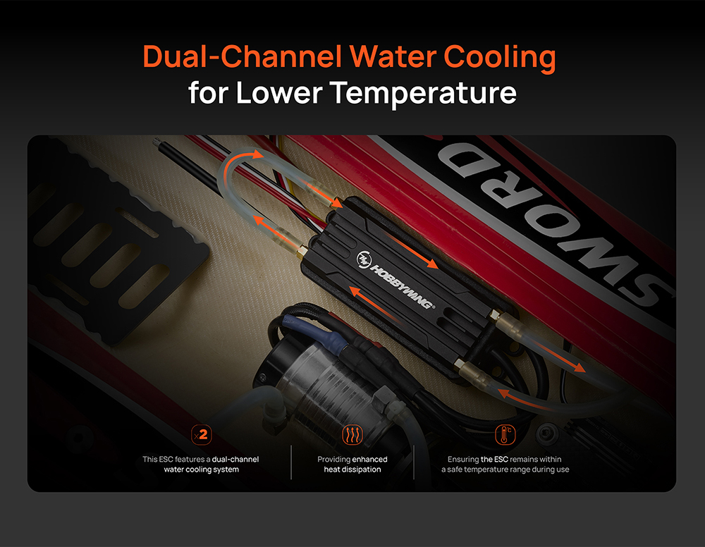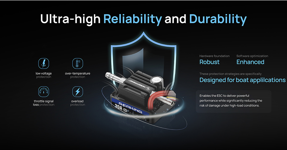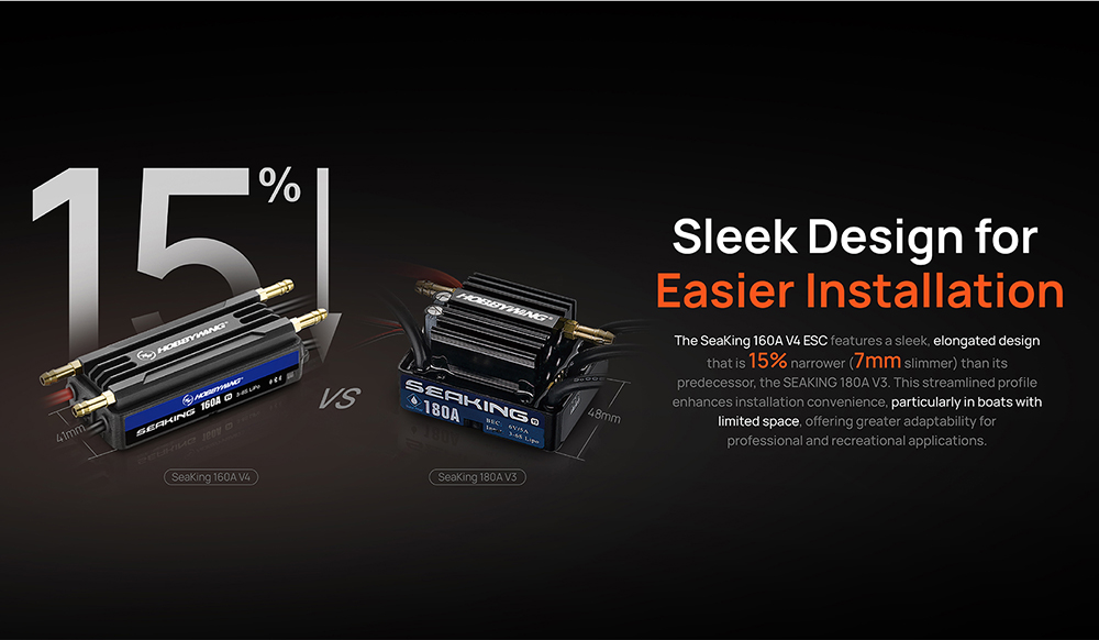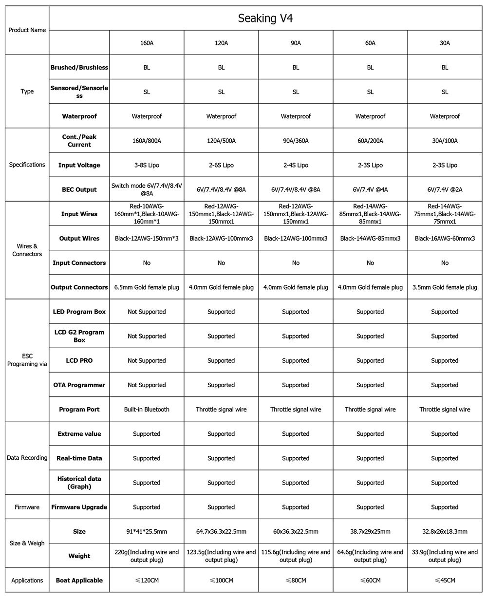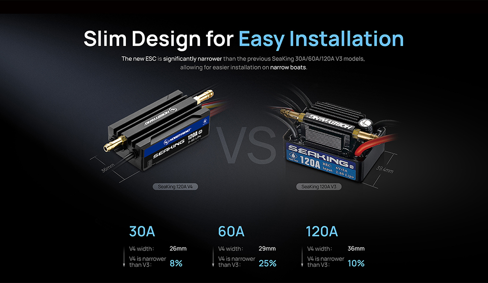 Seaking 160A/120A/90A/60A/30A V4 Brushless ESC,The built-in BEC features a high output current and adjustable output voltage with two or three levels, significantly narrower than the previous SeaKing 30A/60A/120A V3 models,allowing for easier installation on narrow boats.