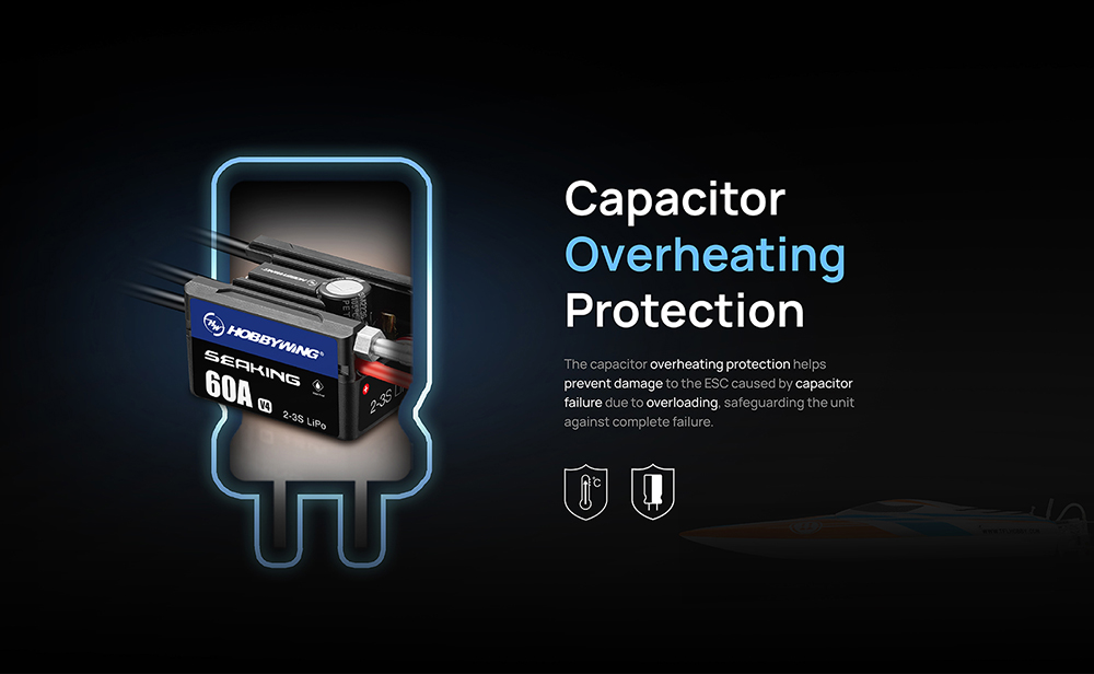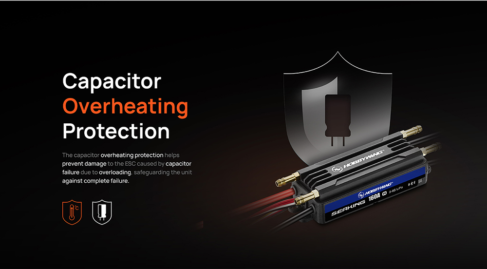 6. The capacitor overheating protection helpsprevent damage to the ESC caused by capacitor failure due to overloading