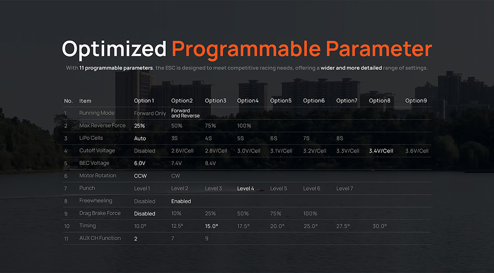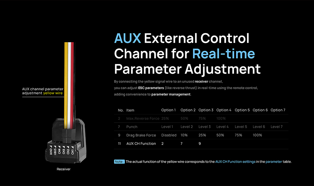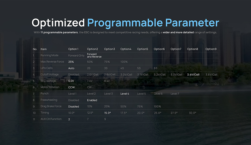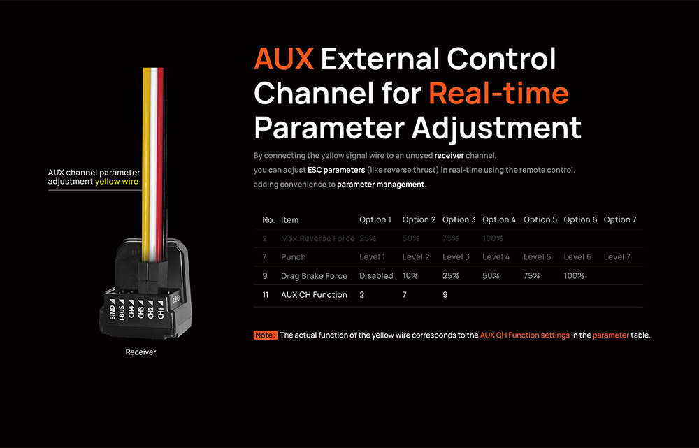 3. The built-in BEC features a high output current and adjustable output voltage withtwo or three levels,