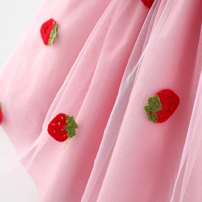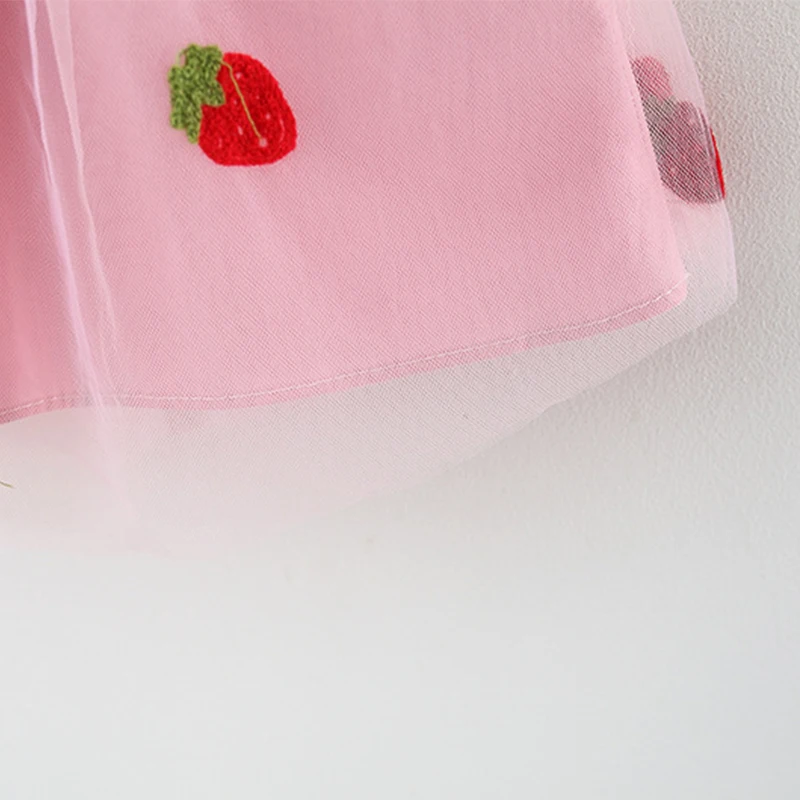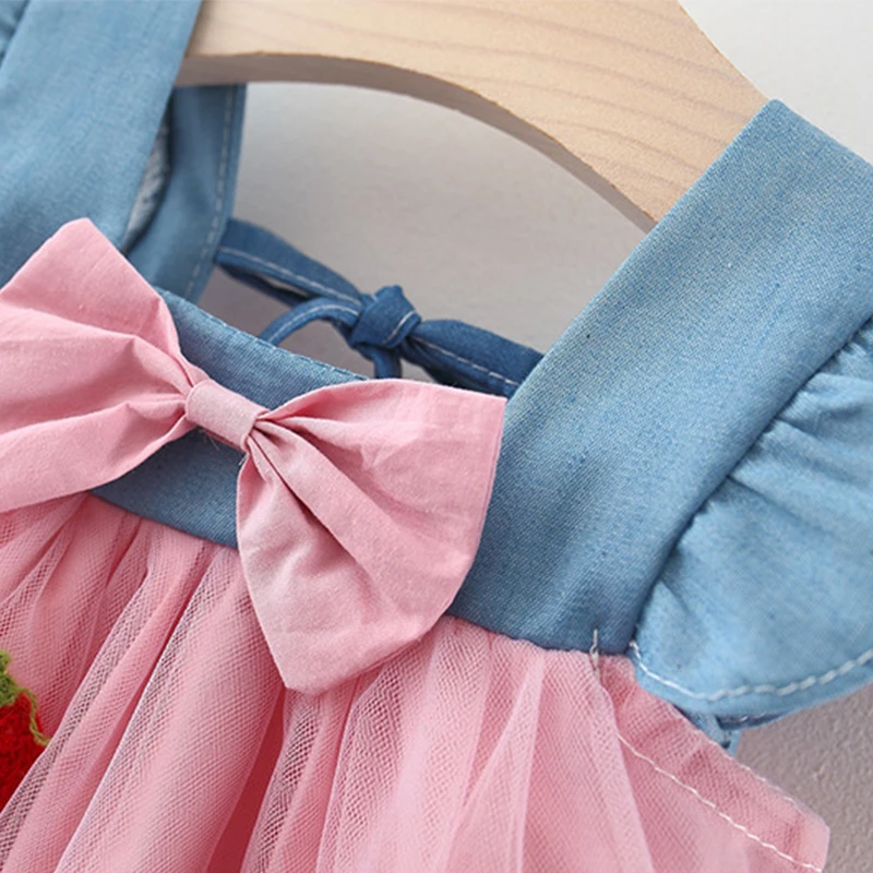 Color: WHITE, Kid Size: 3T?€?€·?¤–运动?‰ - Summer girl dress baby girl small flying sleeves denim top with patchwork strawberry embroidery mesh suspender princess dress