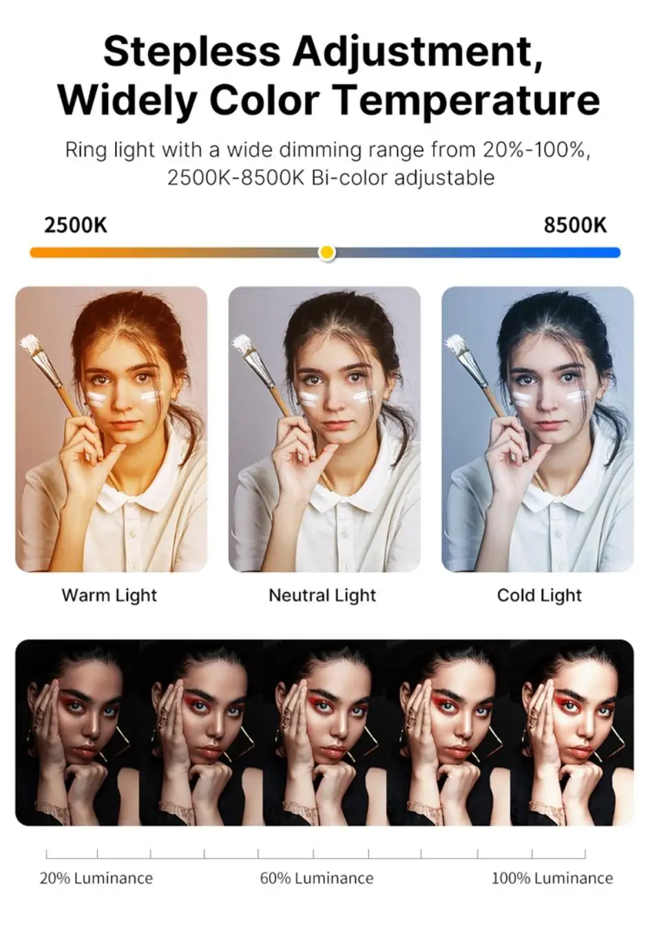 2500K-8500K Color Temperature - The brightness of our ring light can be stepless adjustable from 10%-100%, and the color temperature can be stepless adjustable from 2500K-8500K. Adjust from a warm (orange) light to a cool (white) light to get your perfect skin tones and match your.
