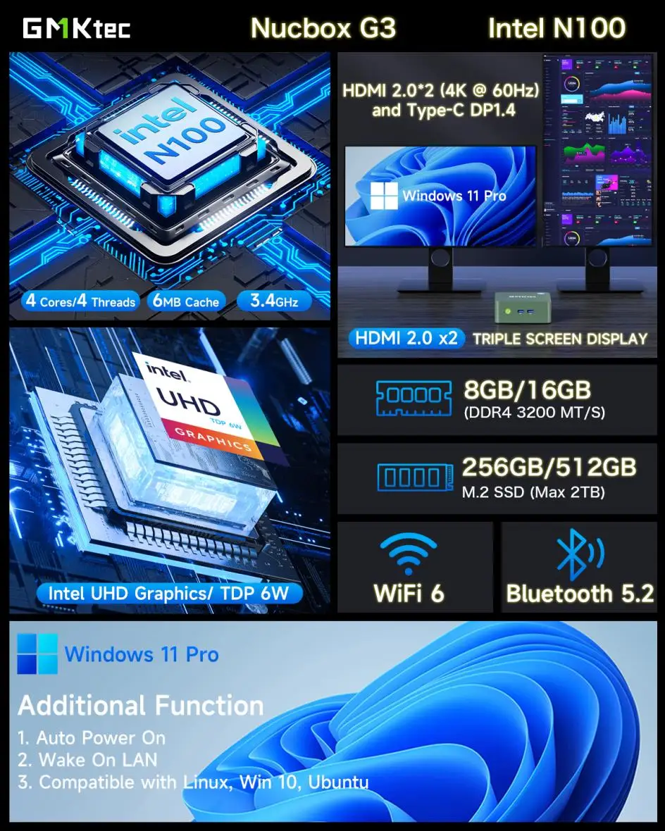 GMKtec mini pc equips with 4-core/4-thread intel N100, the base frequency is 1.8GHz / the dynamic frequency can reach 3.40GHz,with 8GB/16GB of memory capacity, and 256GB/512GB hard drive capacity provides ample storage space for all your files, documents, and media content.